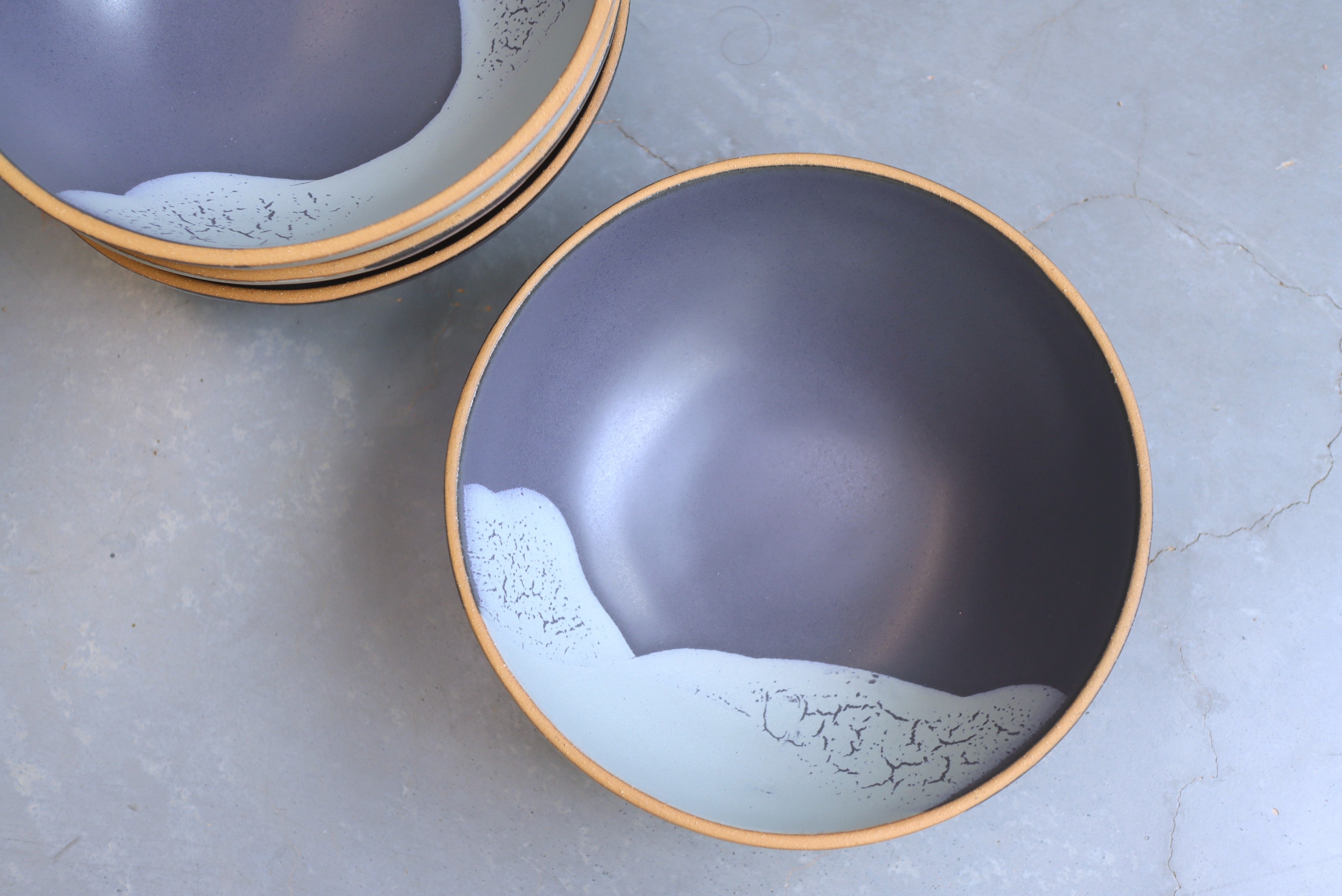 Nautical Twilight is a beautiful pairing of two blue hues. It has changed in finish since we switched to our new kiln, and so it is a much more matte colorway than when we first offered it last year. It is a rich deep navy blue, and paired with Bay Fog it conjures up the sea and clouds at night, with peaks of raw clay representing mountains.