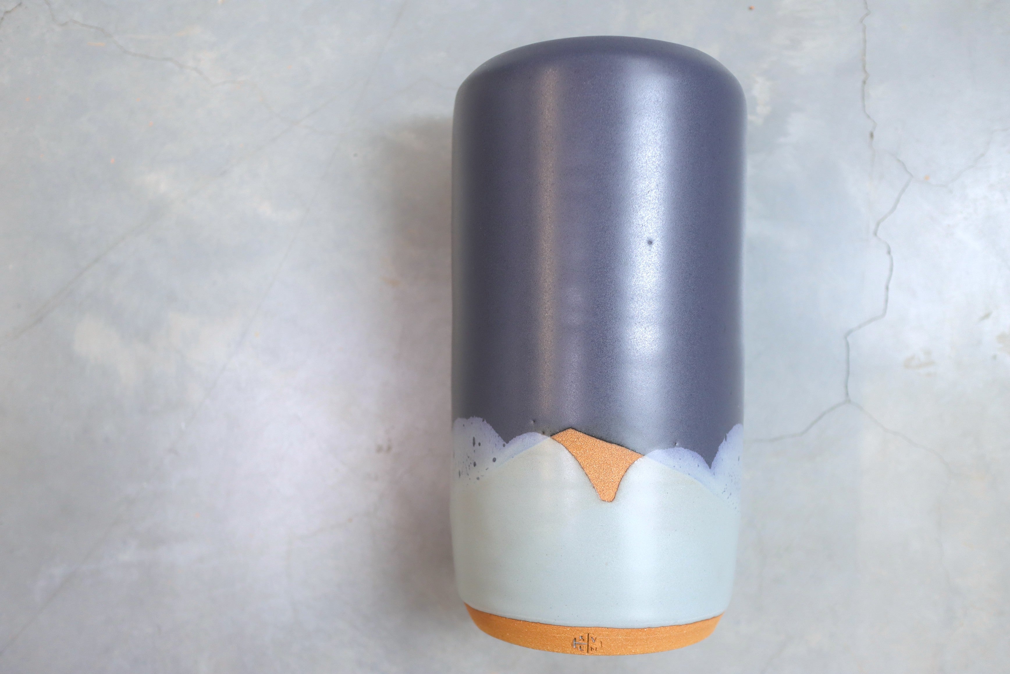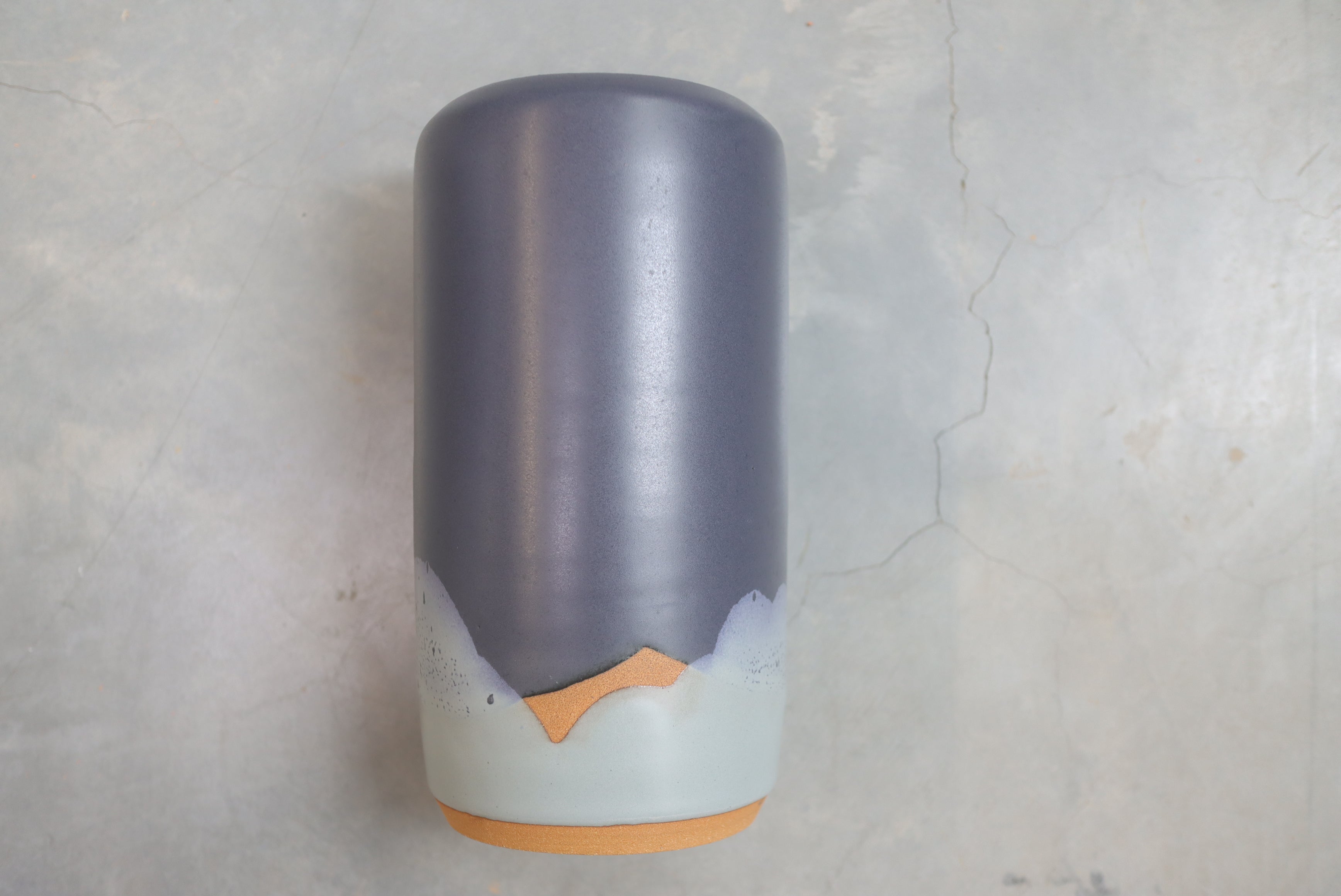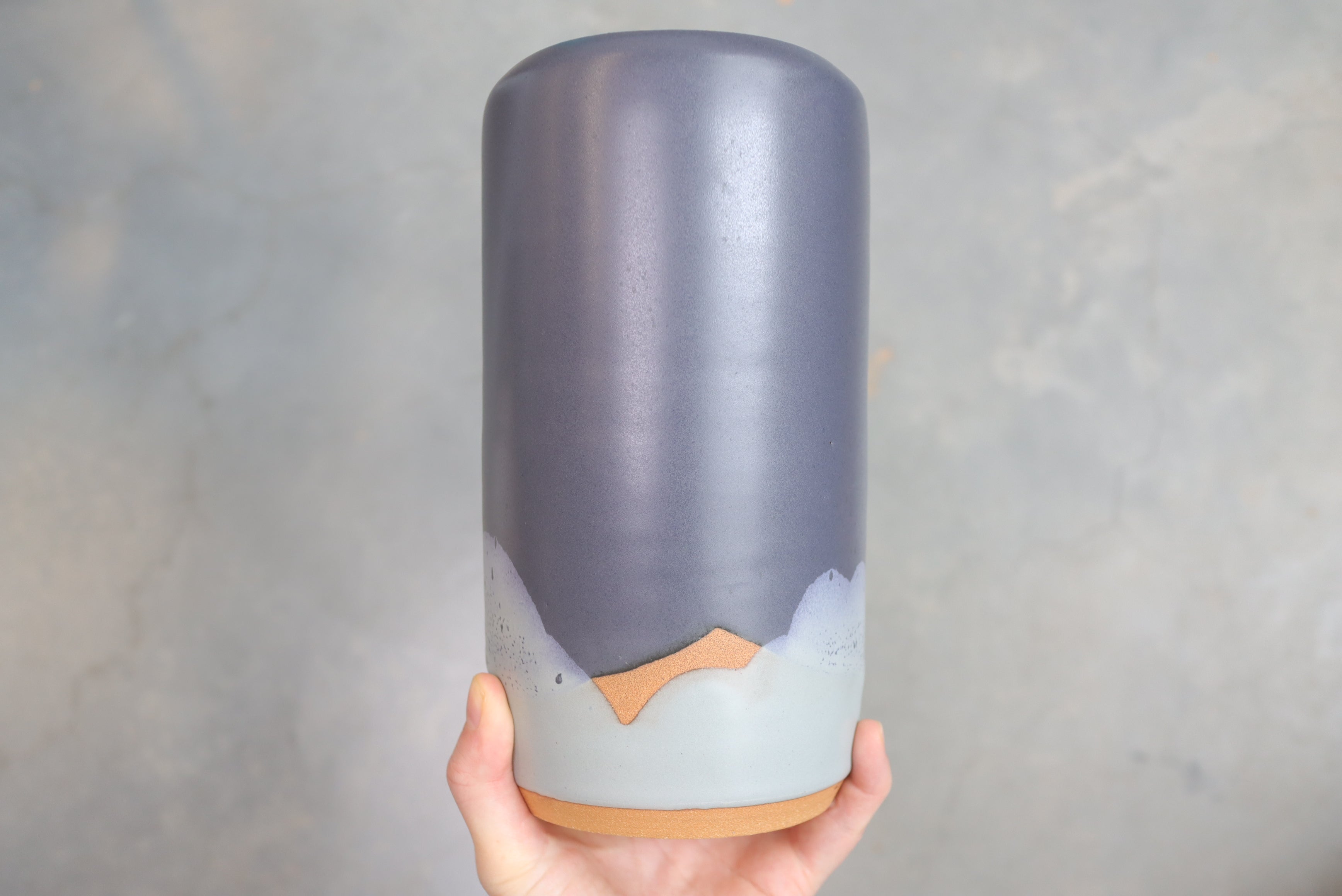 Nautical Twilight is a beautiful pairing of two blue hues. It has changed in finish since we switched to our new kiln, and so it is a much more matte colorway than when we first offered it last year. It is a rich deep navy blue, and paired with Bay Fog it conjures up the sea and clouds at night, with peaks of raw clay representing mountains.