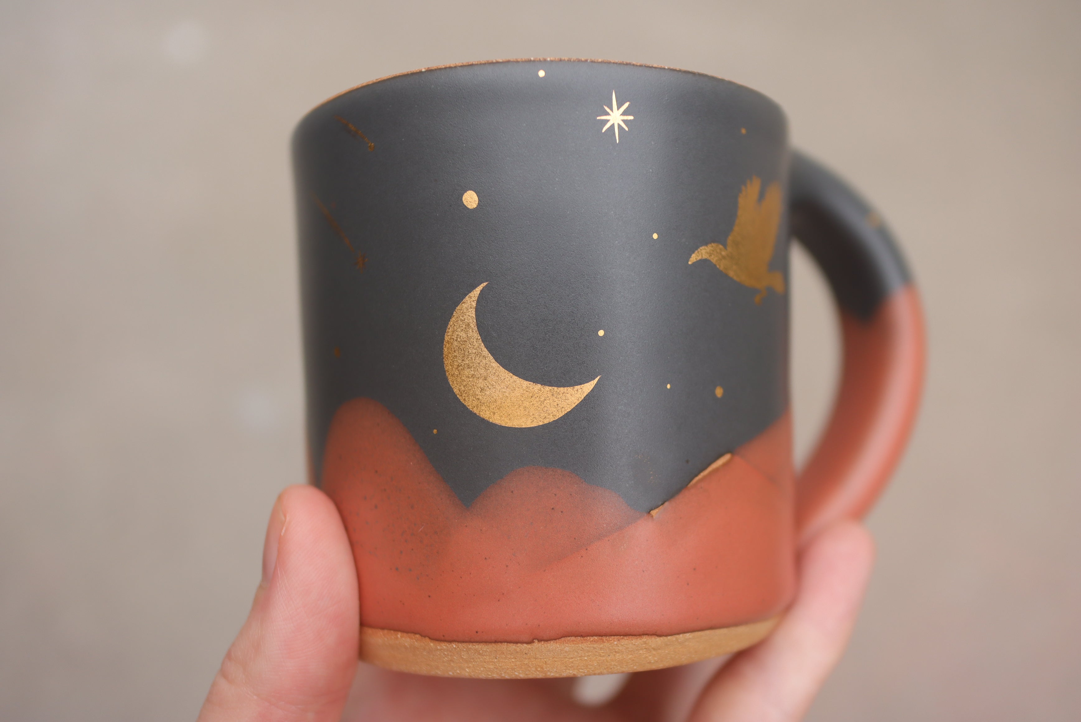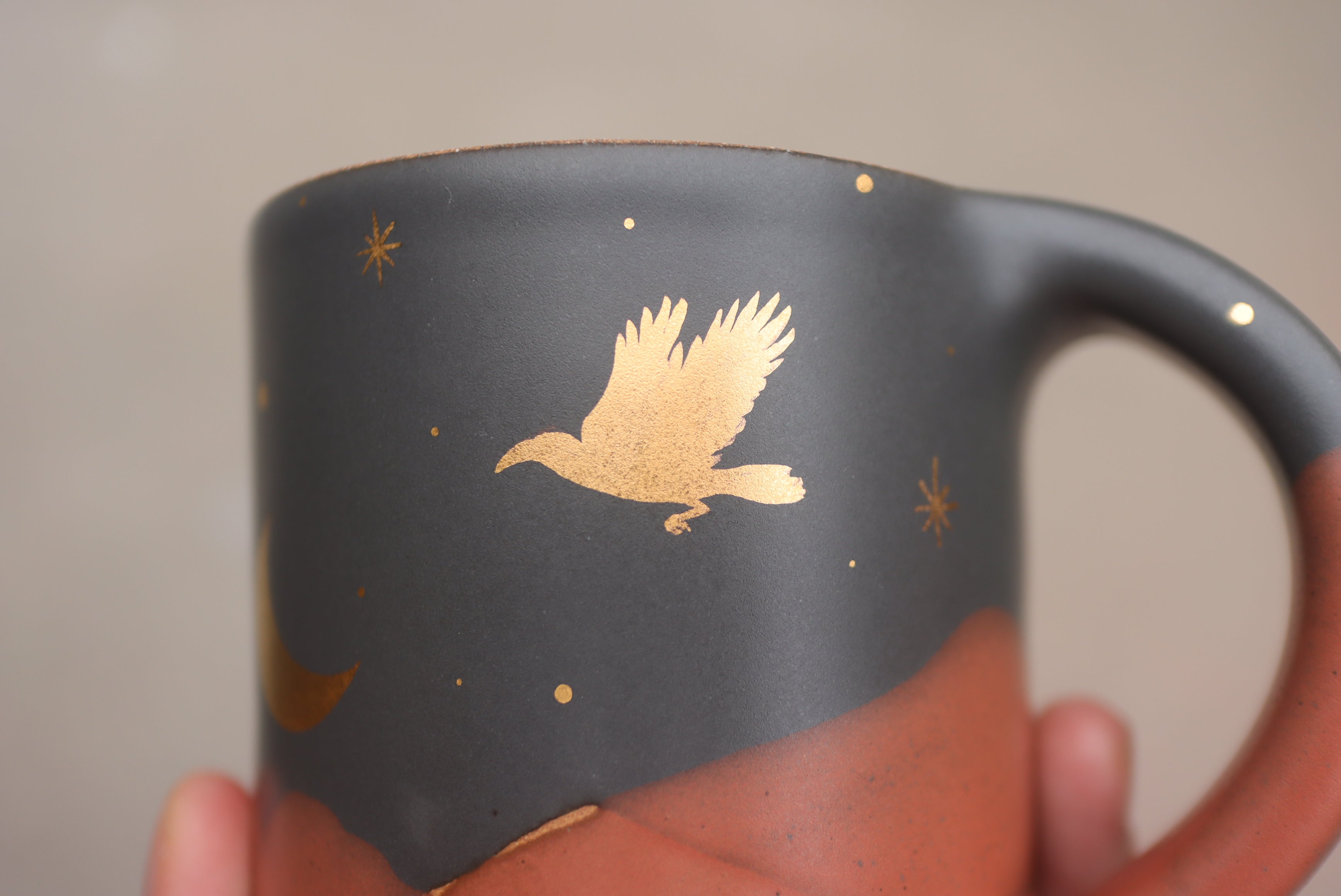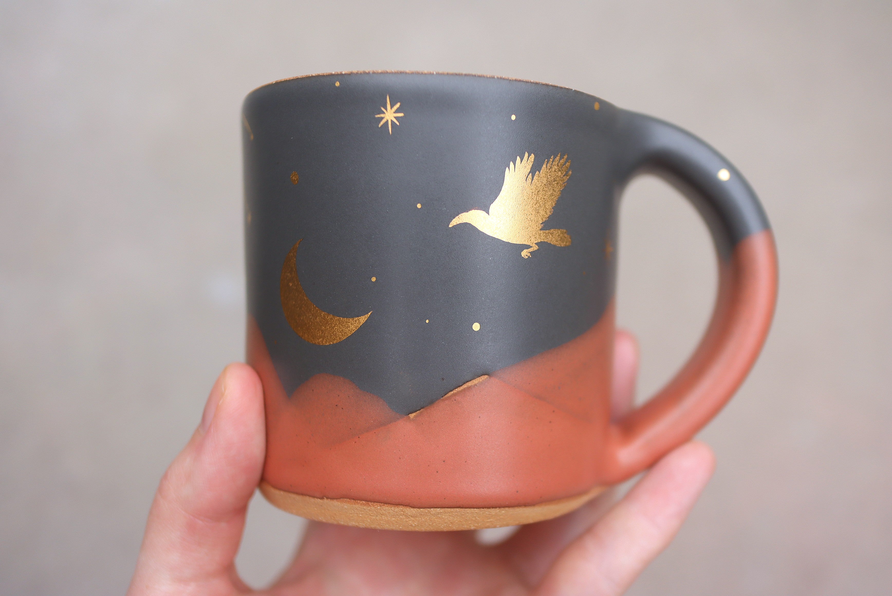 12 oz Midnight Fox Classic Mug with Hand Painted 22k Gold Lustre Crescent Moon and Raven