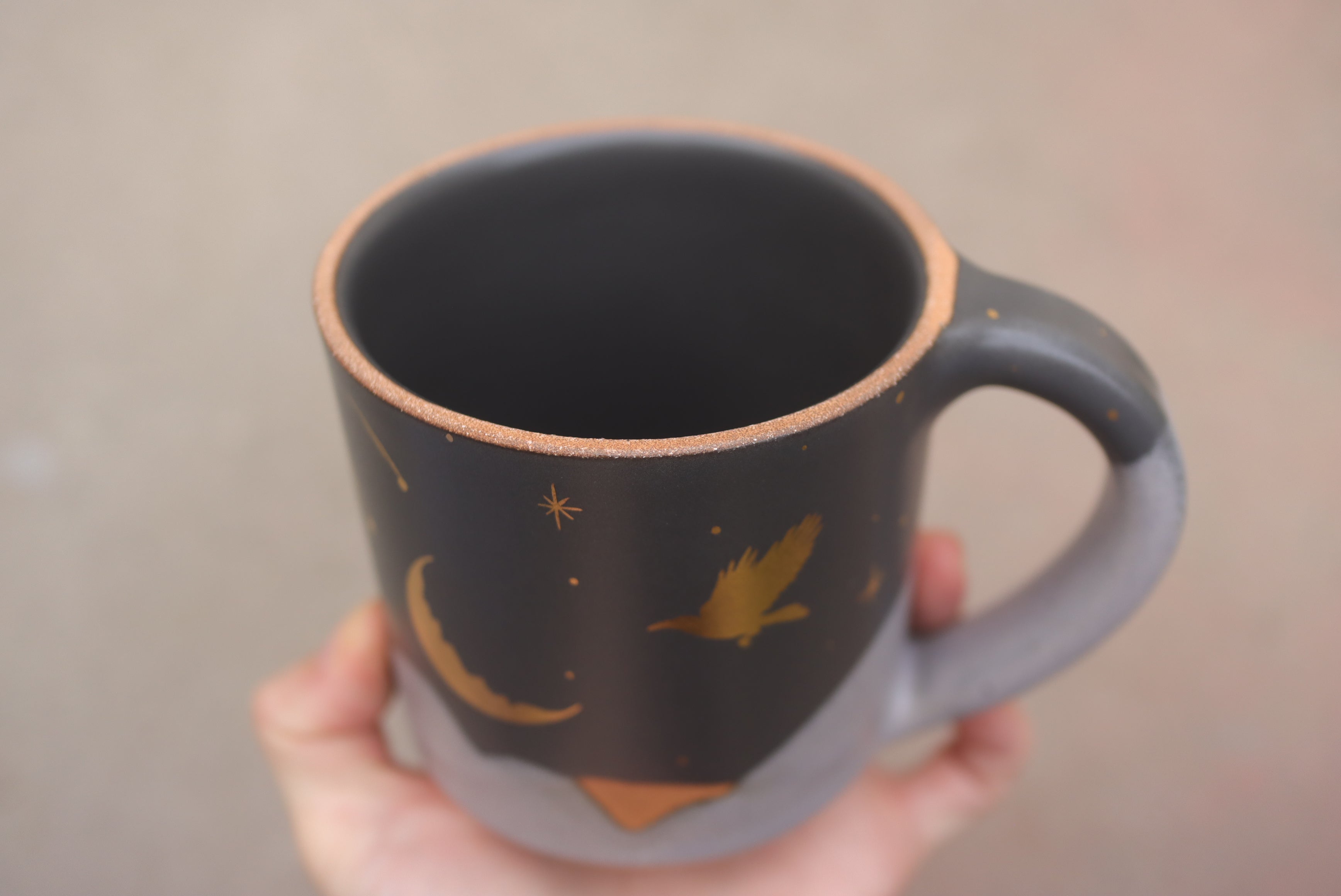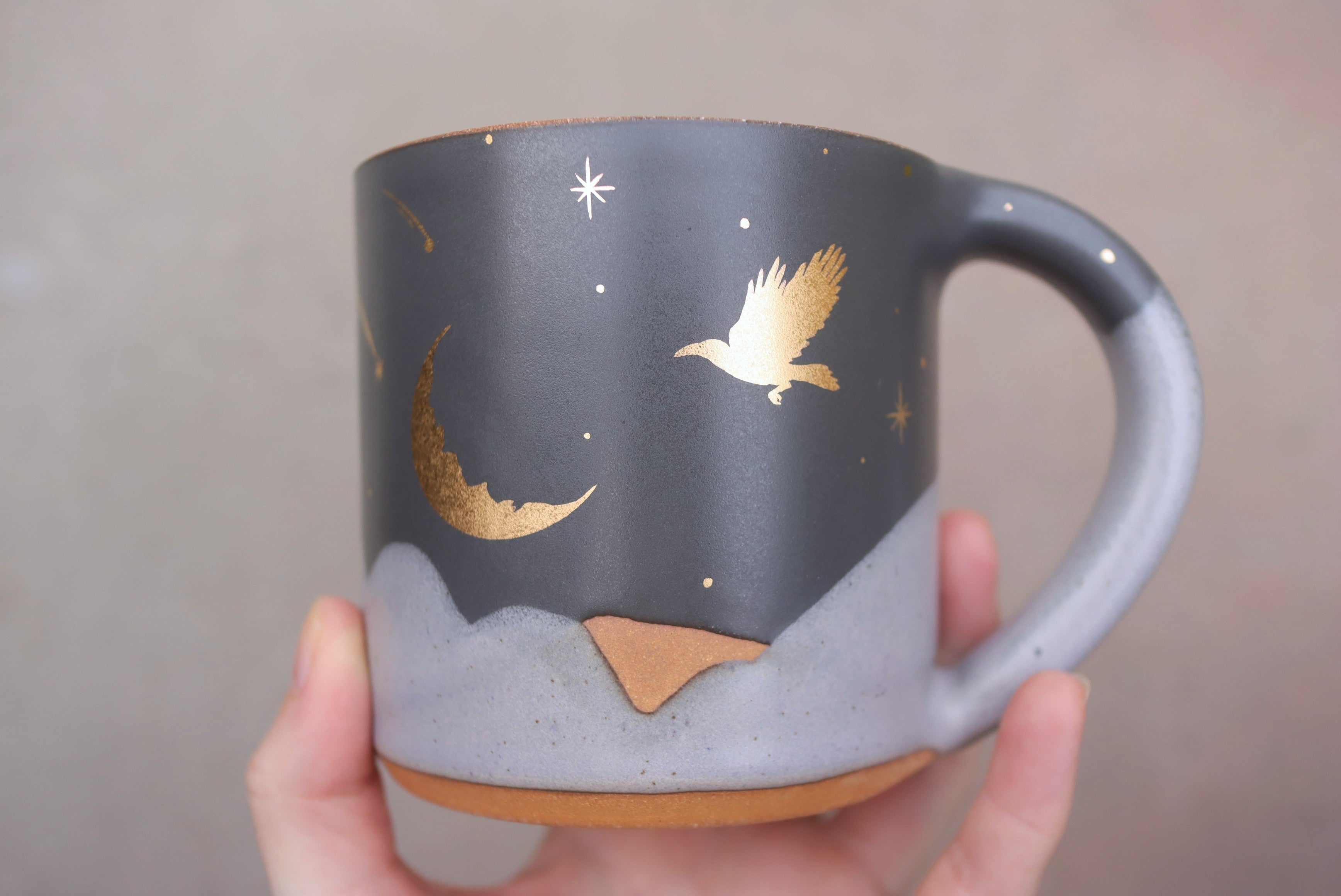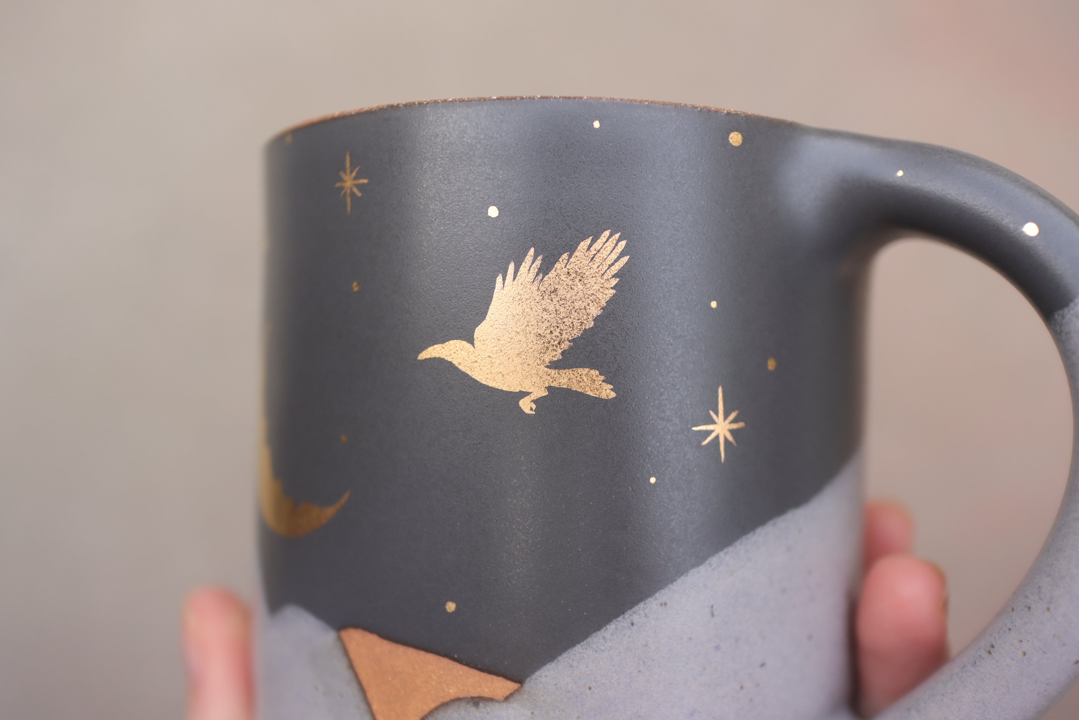 18 oz Midnight Mist Classic Mug with Hand Painted 22k Gold Lustre Crescent Moon and Raven