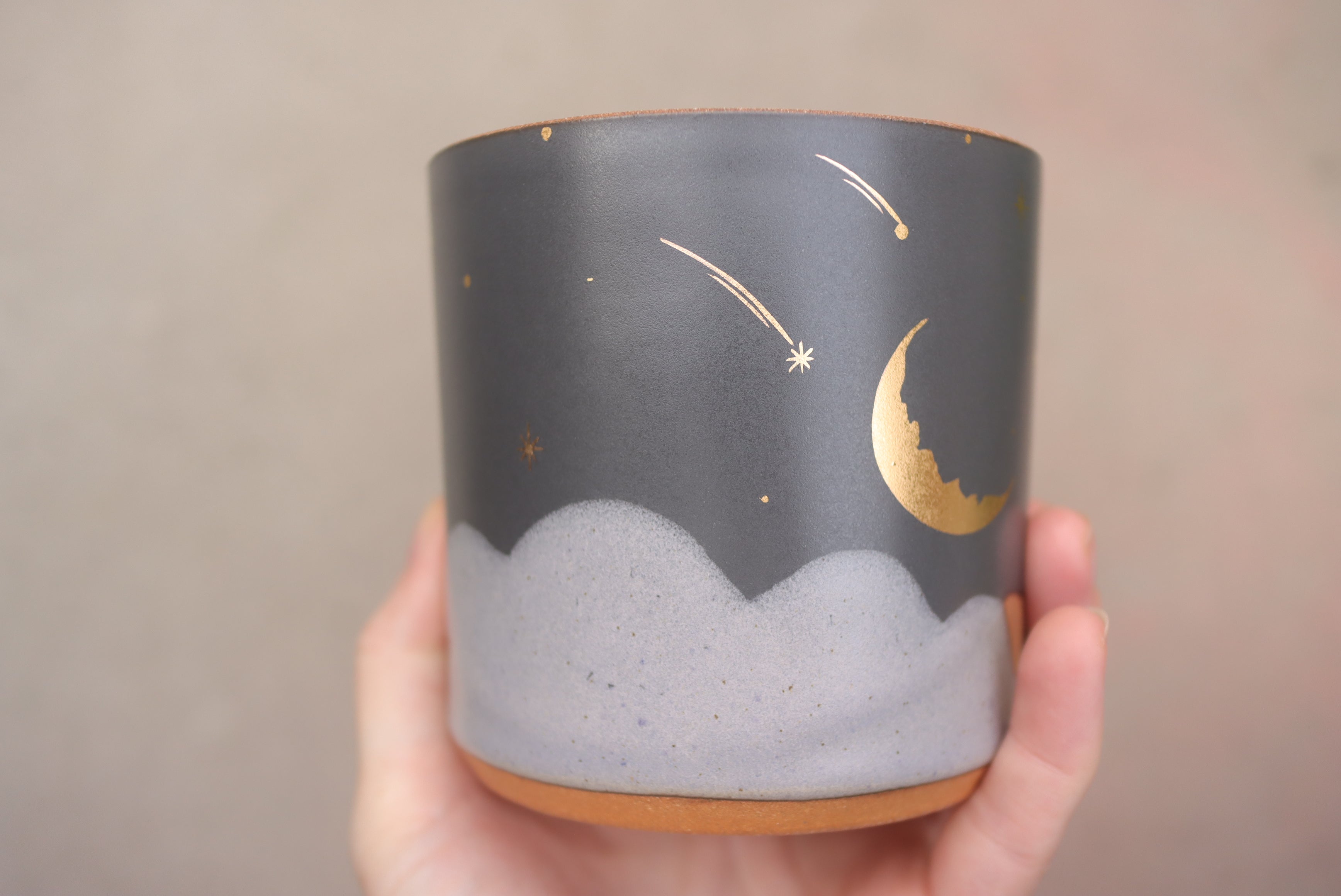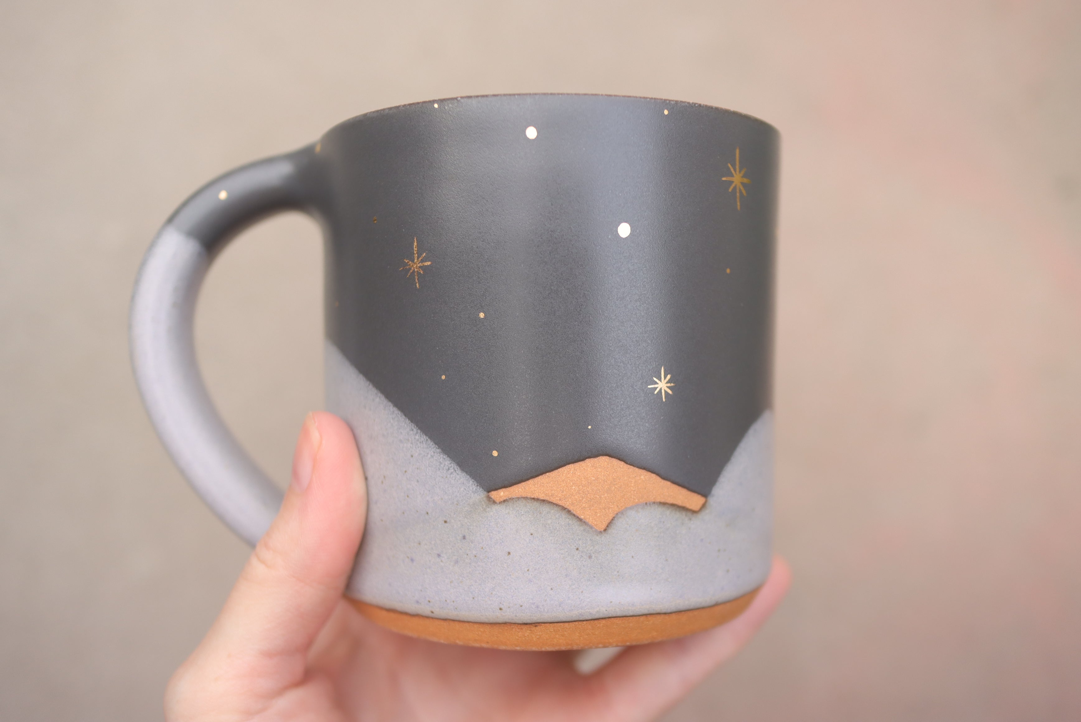 Midnight Mist is a subtle twist on our classic Midnight colorway. Instead of Vanilla Bean 'clouds', the second glaze is our grey Soapstone. .