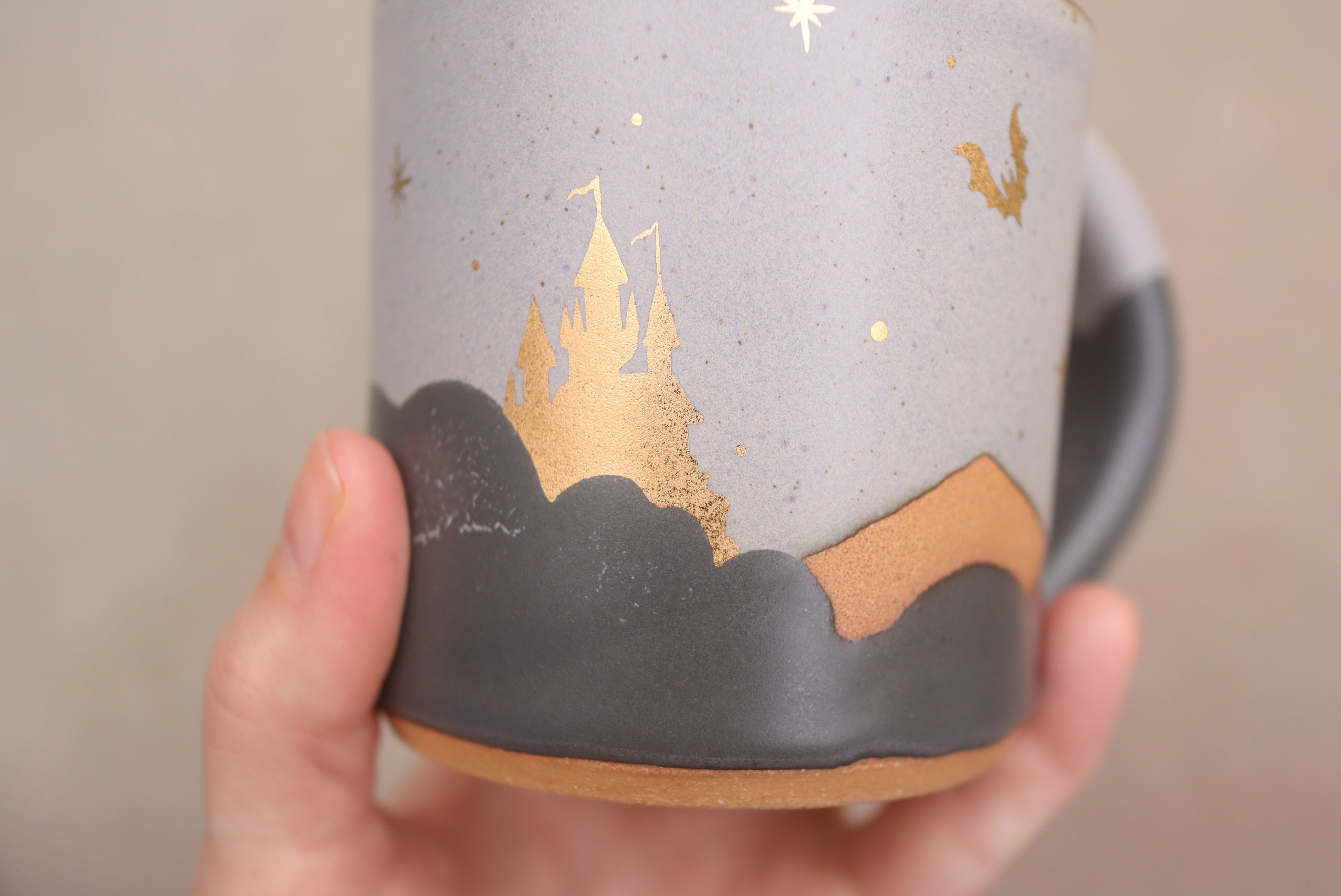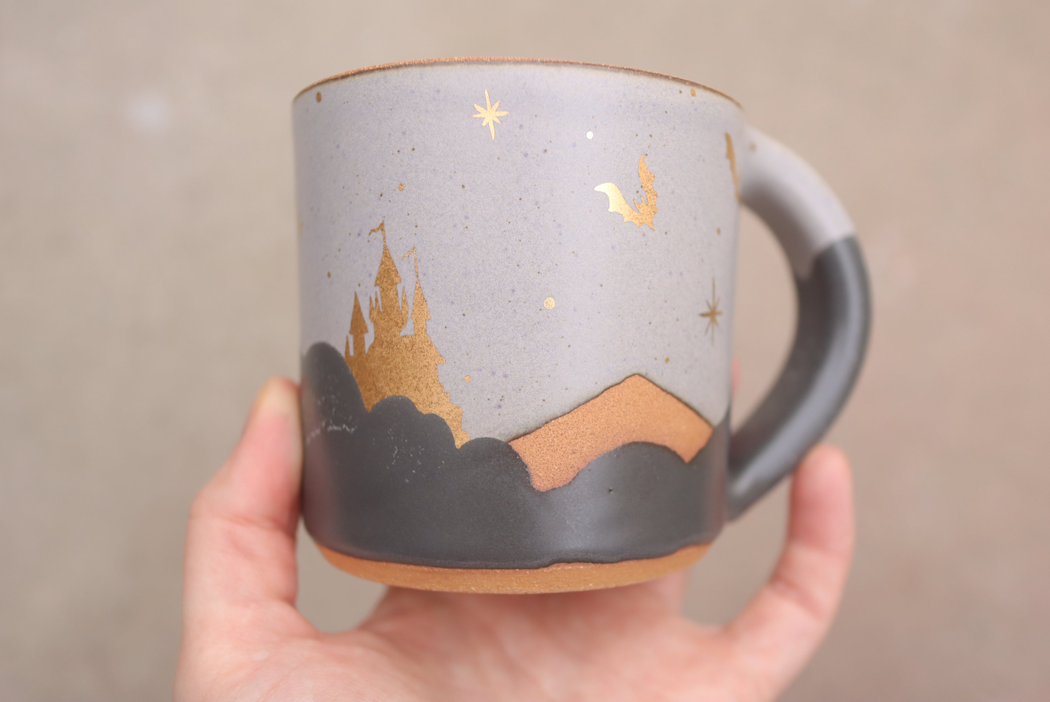 12 oz Classic Shadow Mist Mug with Hand Painted 22k Gold Lustre Haunted Castle and Bats