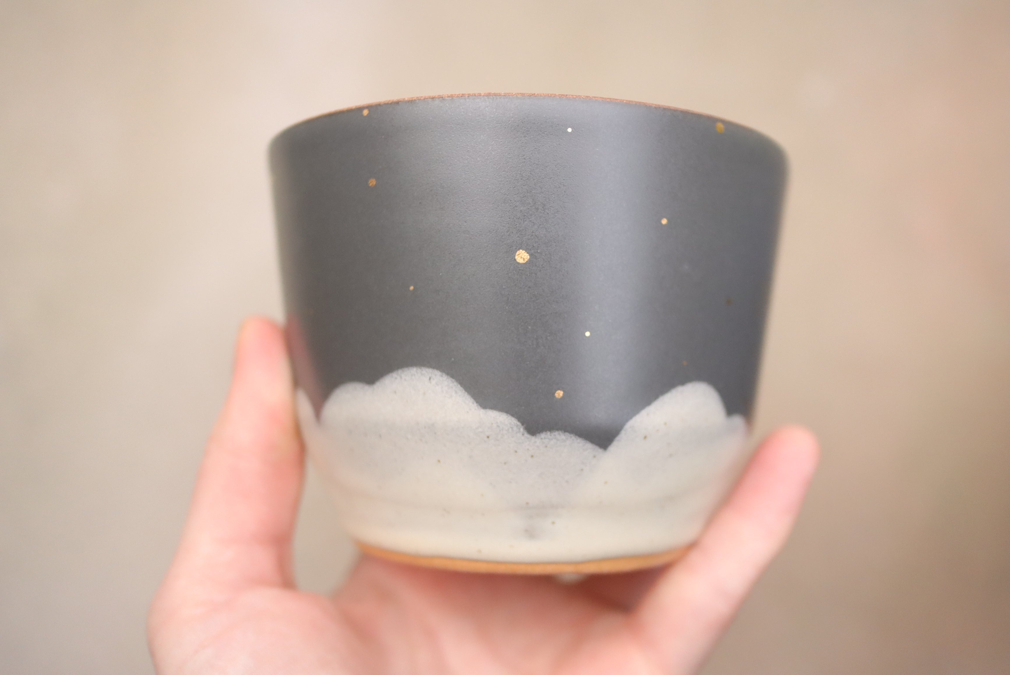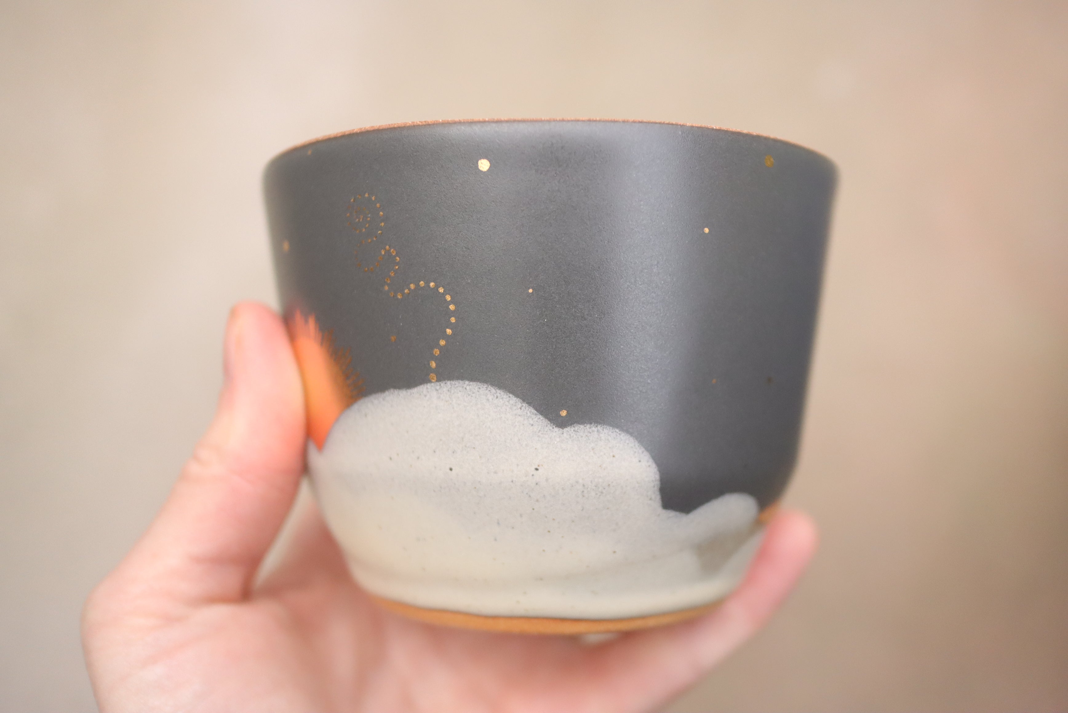 12 oz Midnight Latte Cup with Hand Painted 22k Gold Lustre Crescent Moon and Whimsy