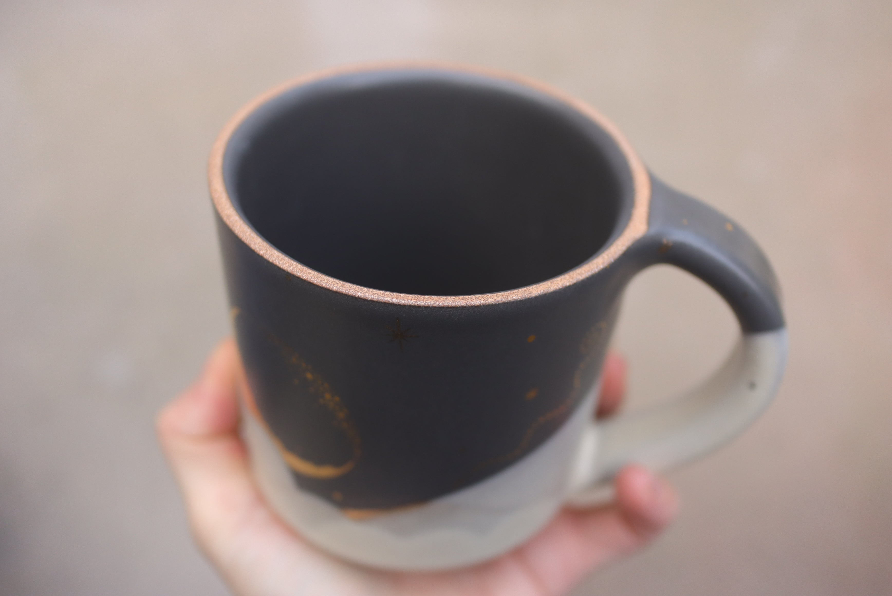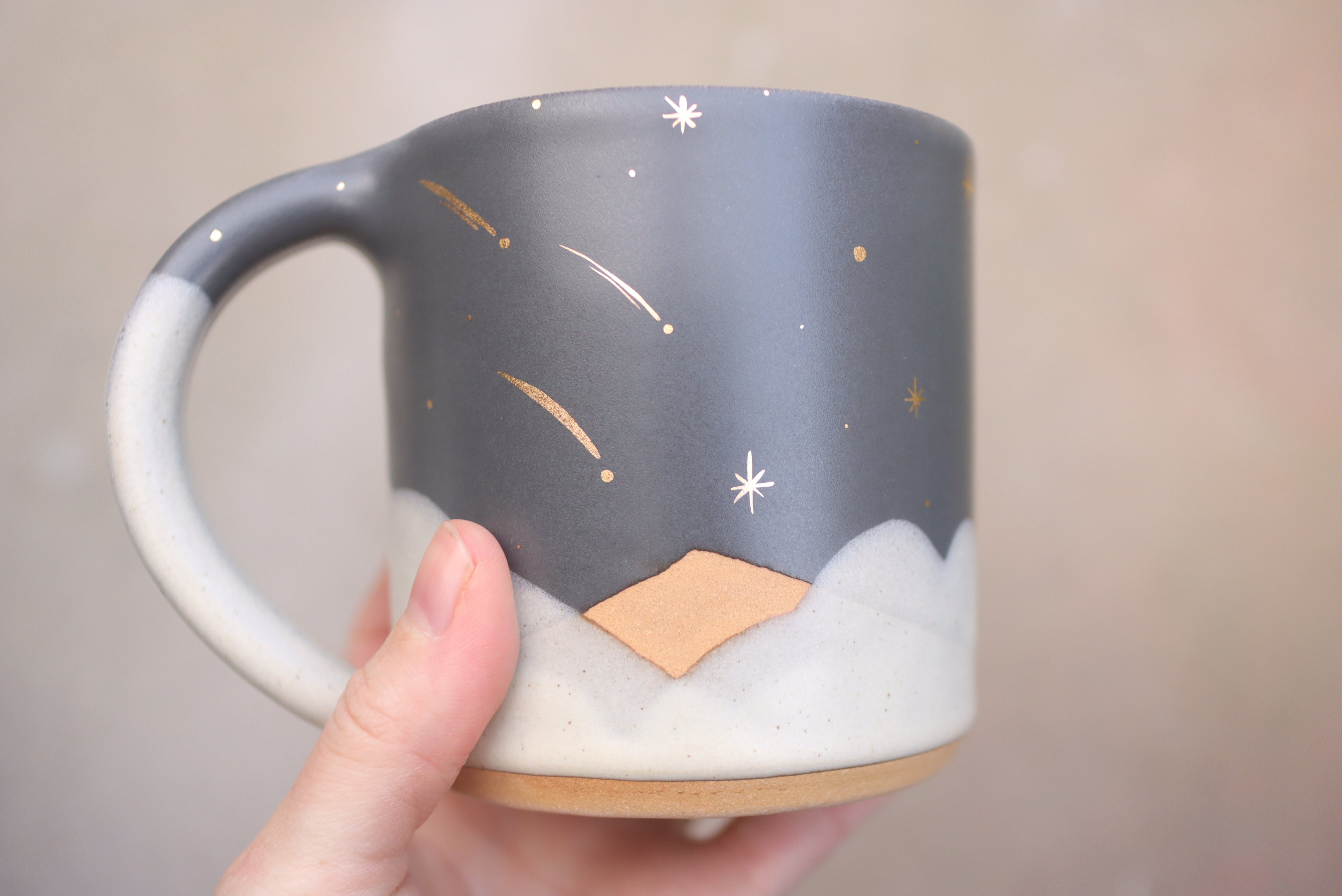 18 oz Midnight Classic Mug with Hand Painted 22k Gold Lustre Crescent Moon with Moonshadow and Whimsy