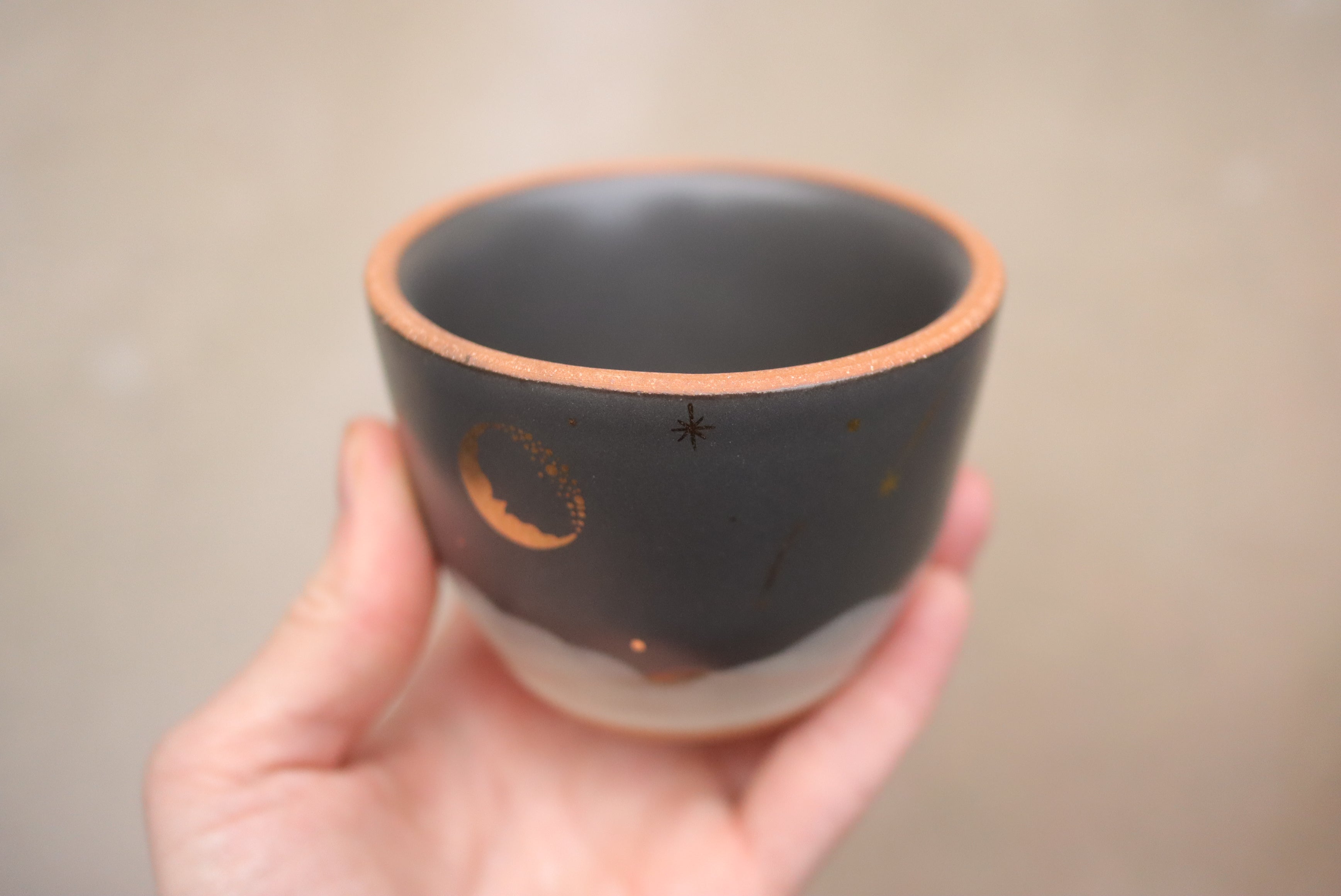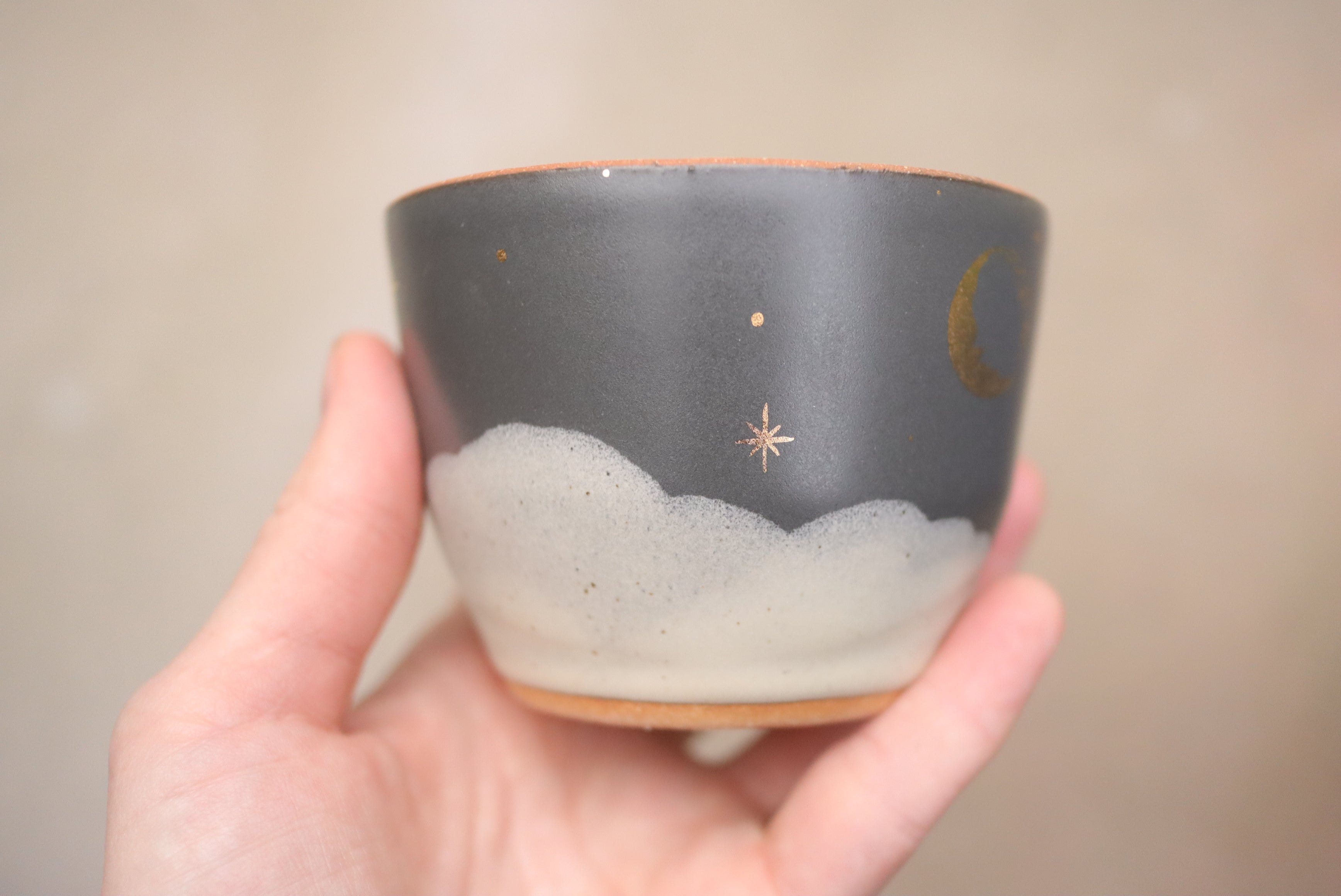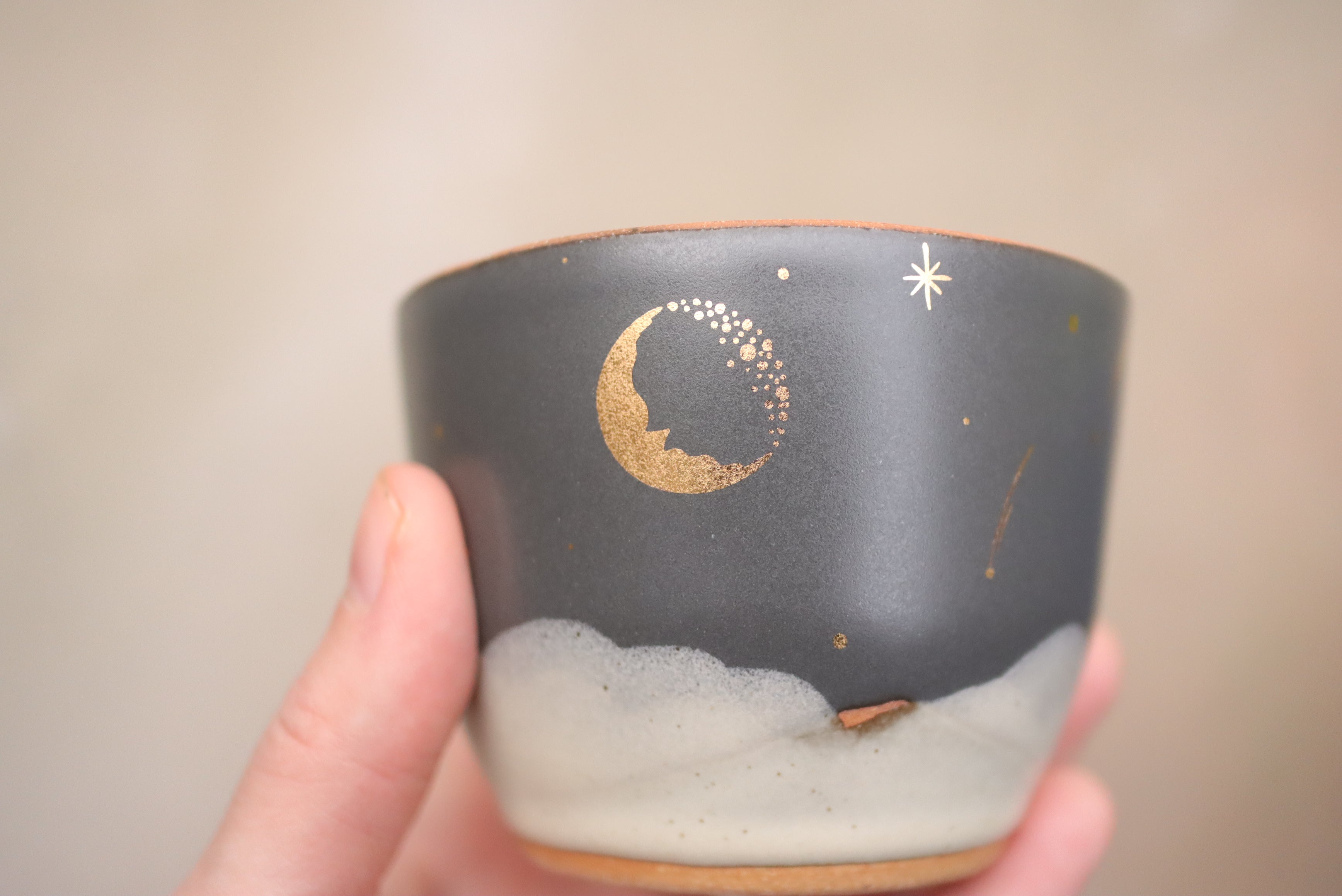 6 oz Midnight Cappuccino Cup with Hand Painted 22k Gold Lustre Crescent Moon and Moonshadow