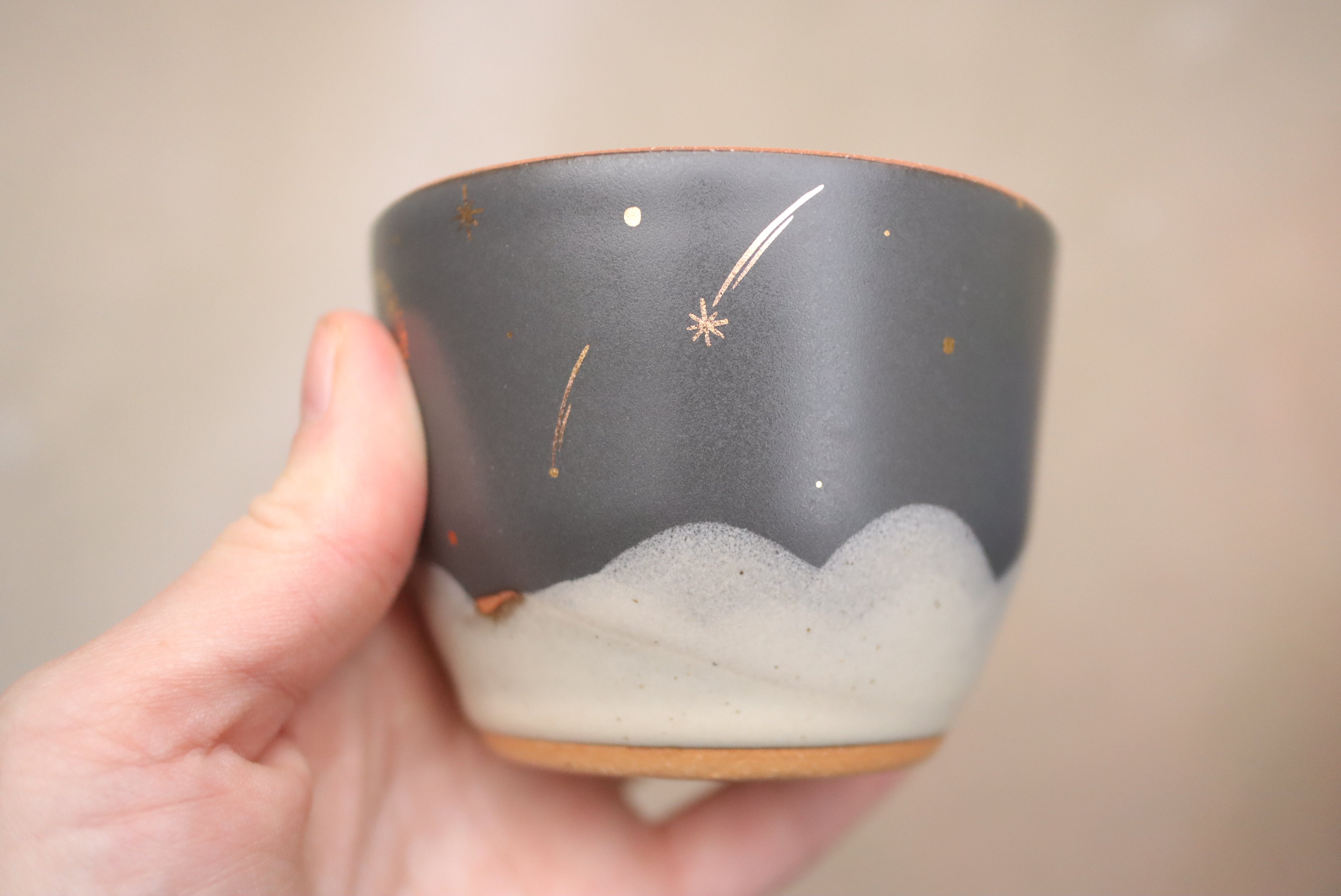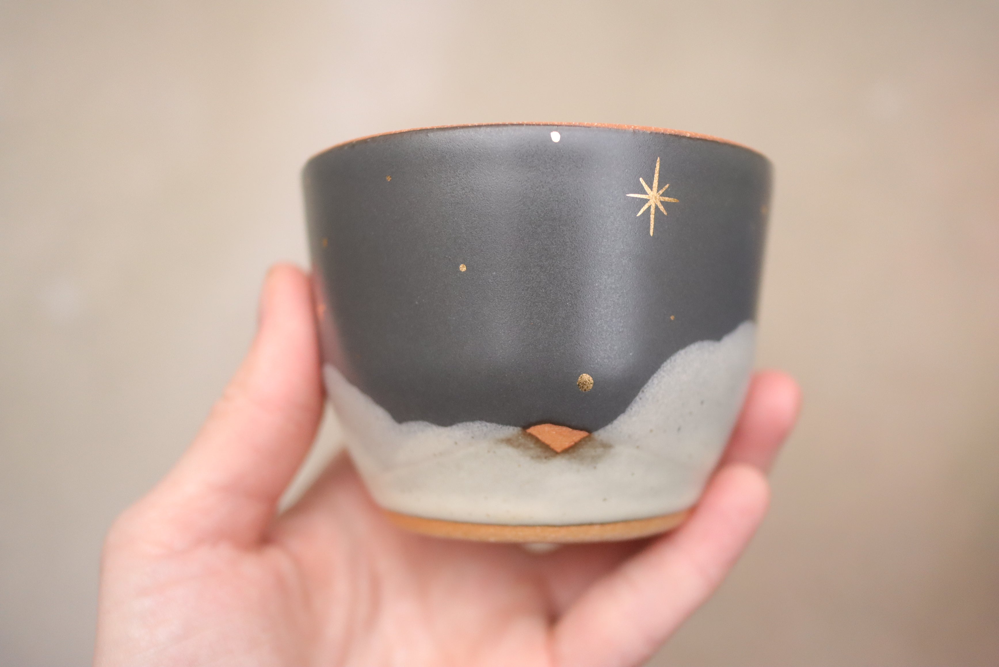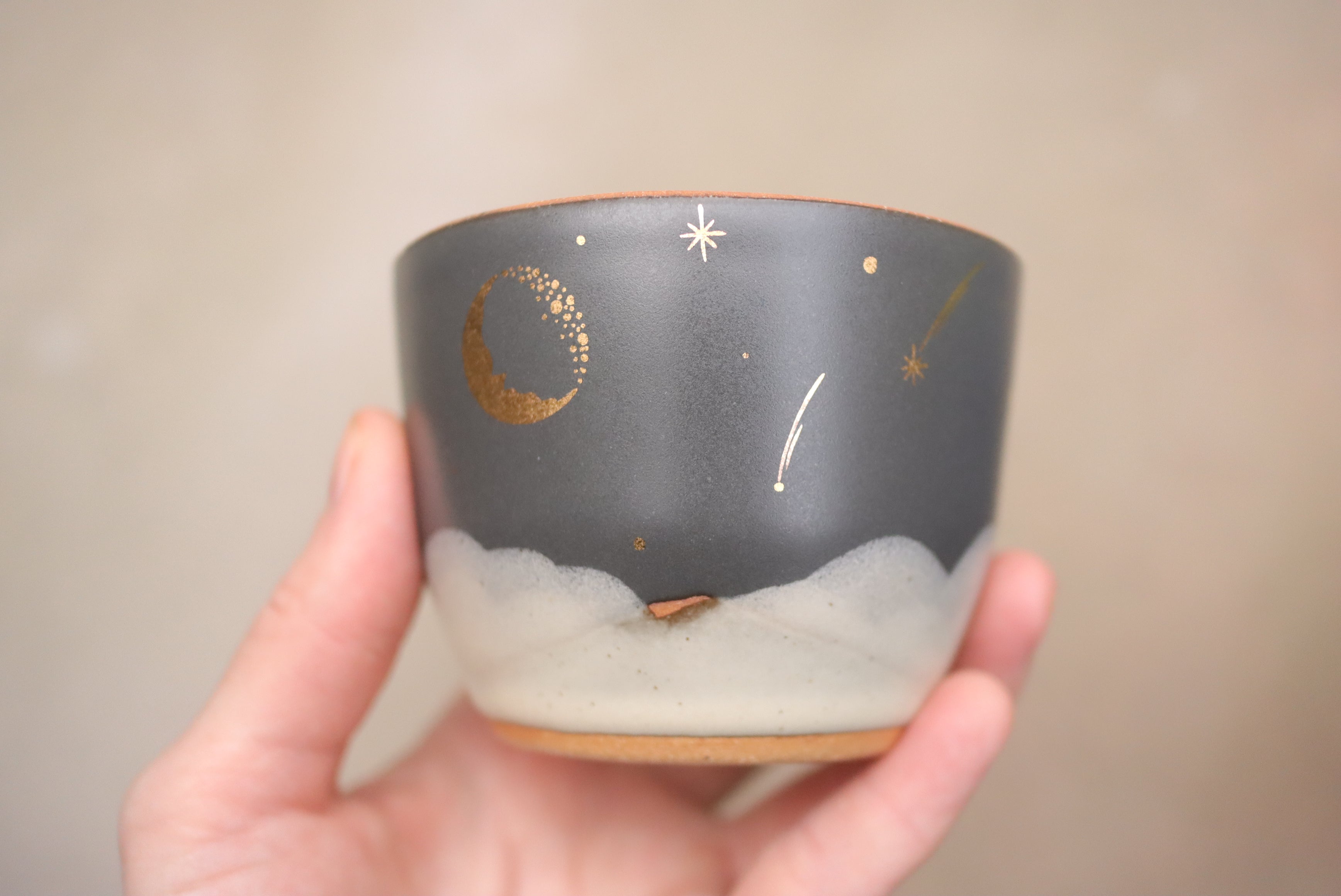 6 oz Midnight Cappuccino Cup with Hand Painted 22k Gold Lustre Crescent Moon and Moonshadow