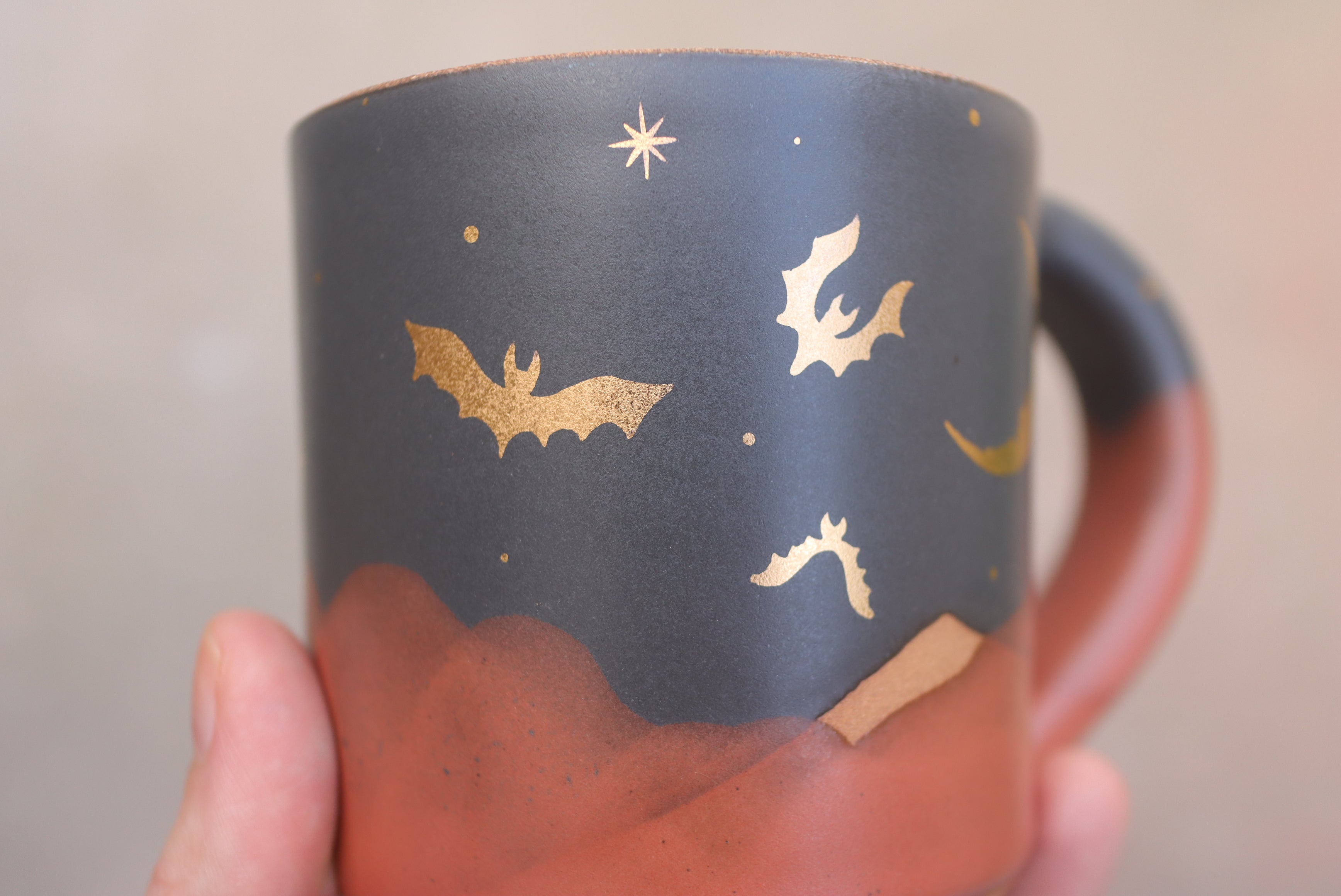 12 oz Midnight Fox Classic Mug with Hand Painted 22k Gold Lustre Crescent Moon and Bats