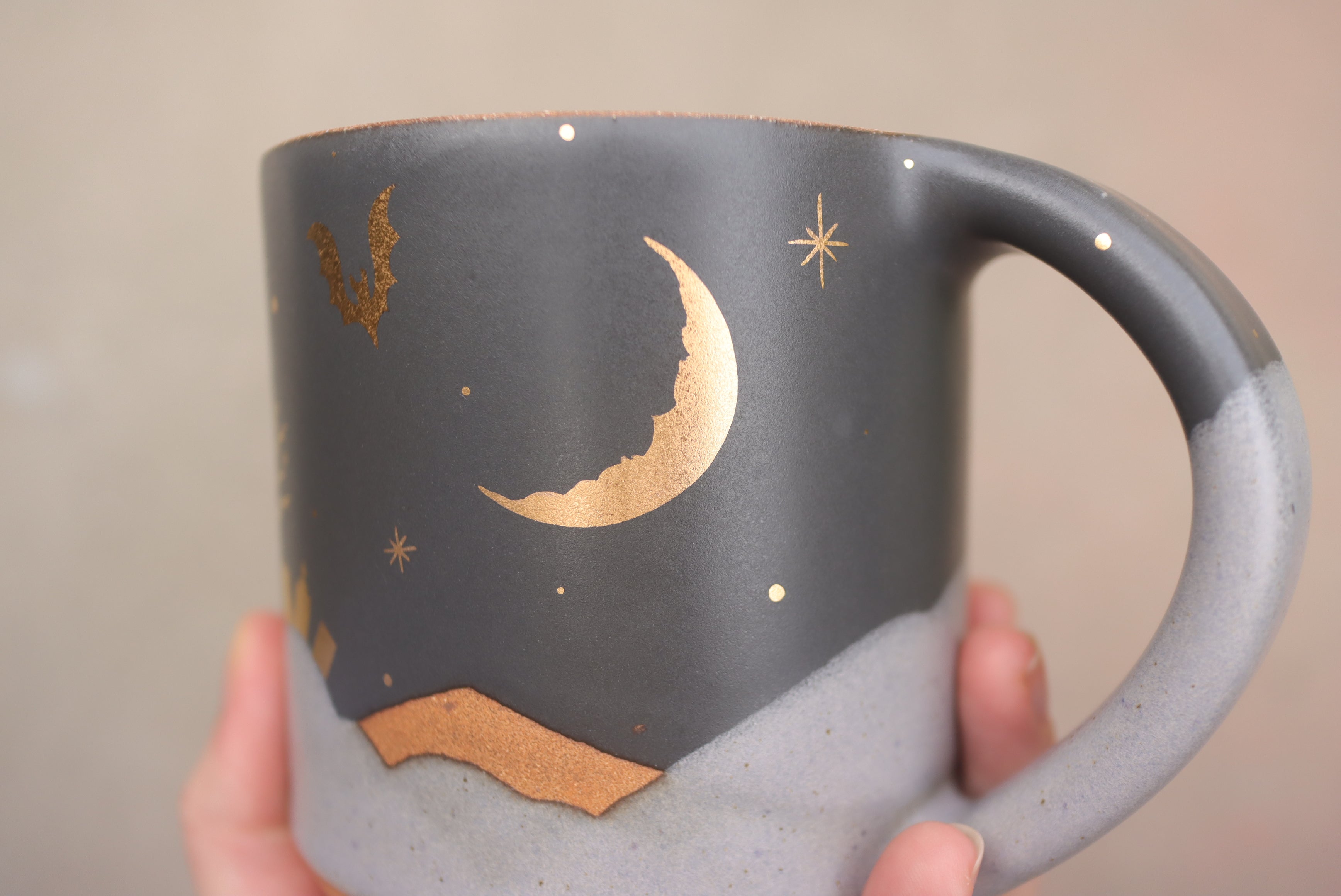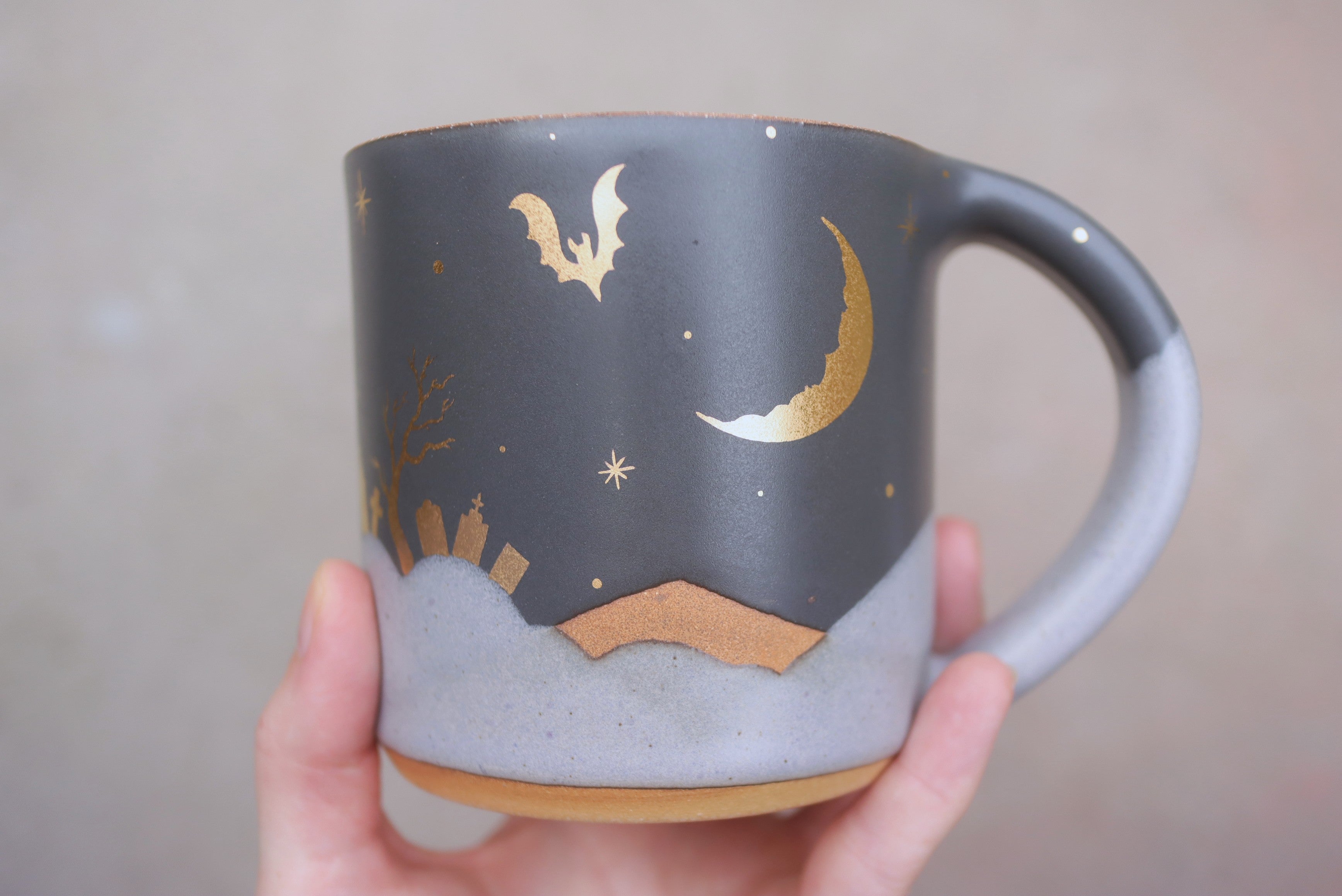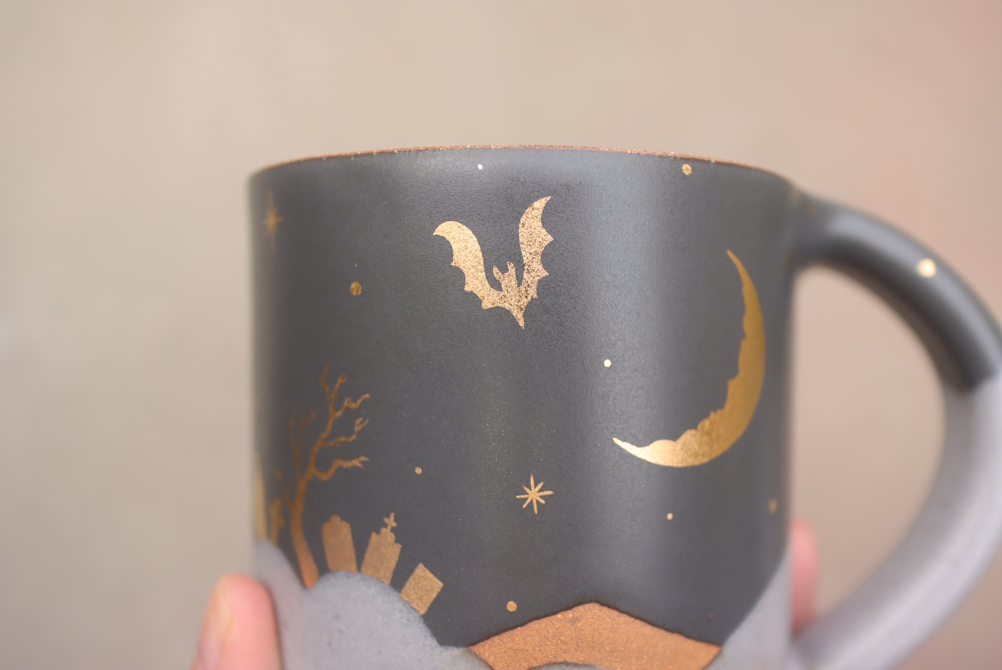 18 oz Midnight Fox Classic Mug with Hand Painted 22k Gold Lustre Crescent Moon and Bats over a Cemetery