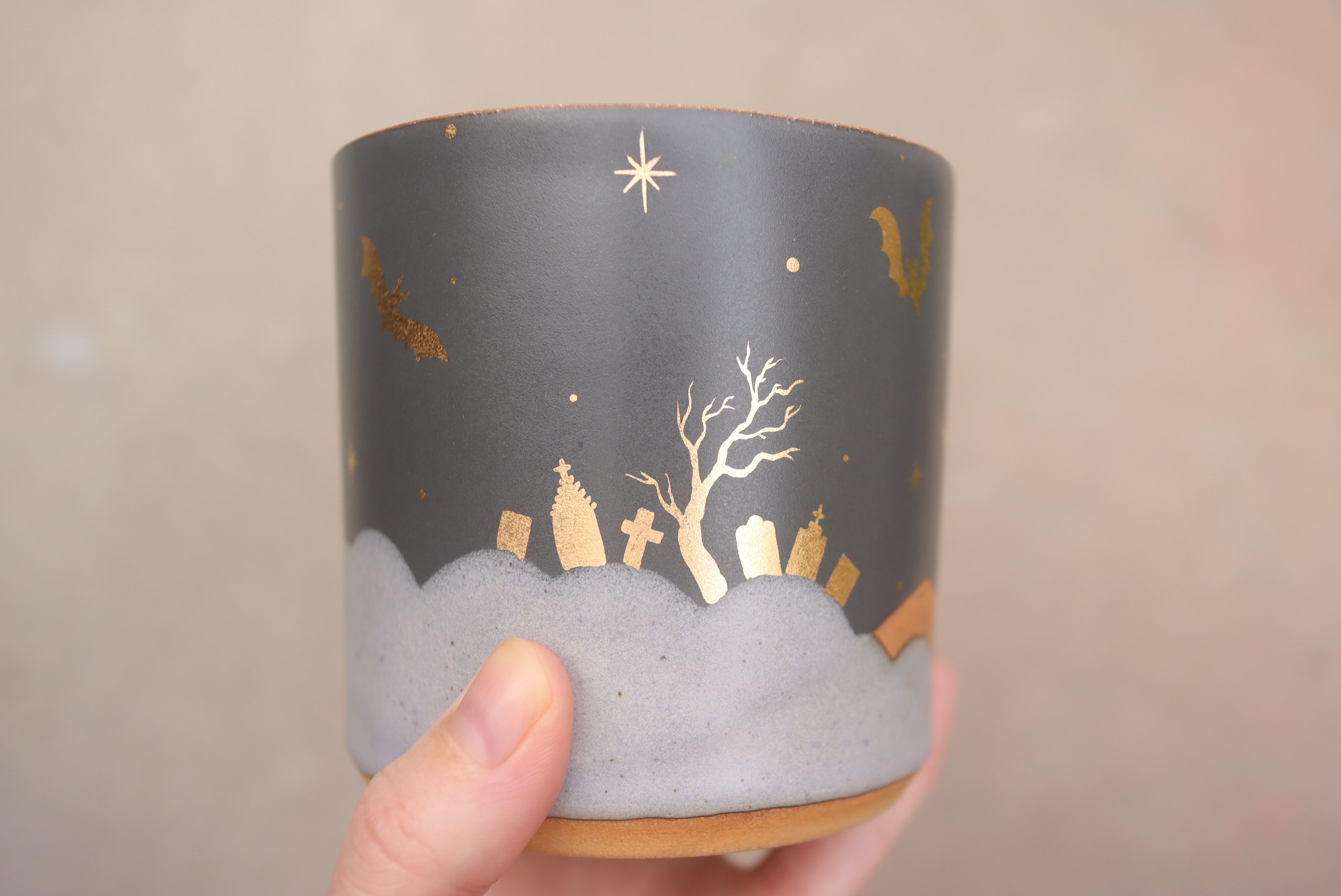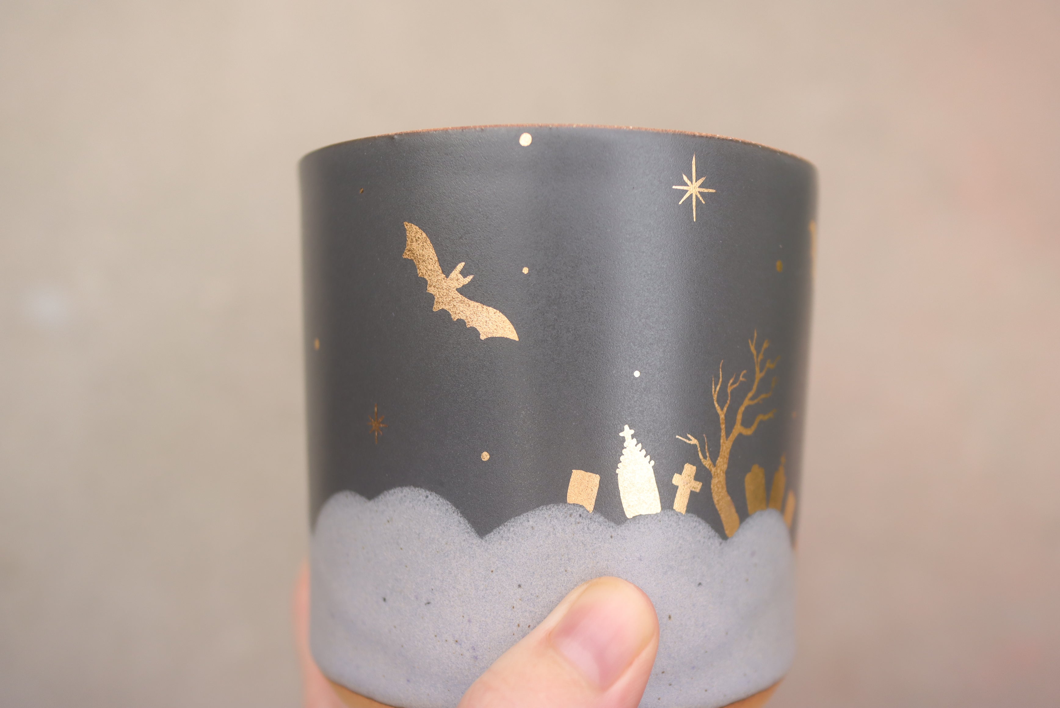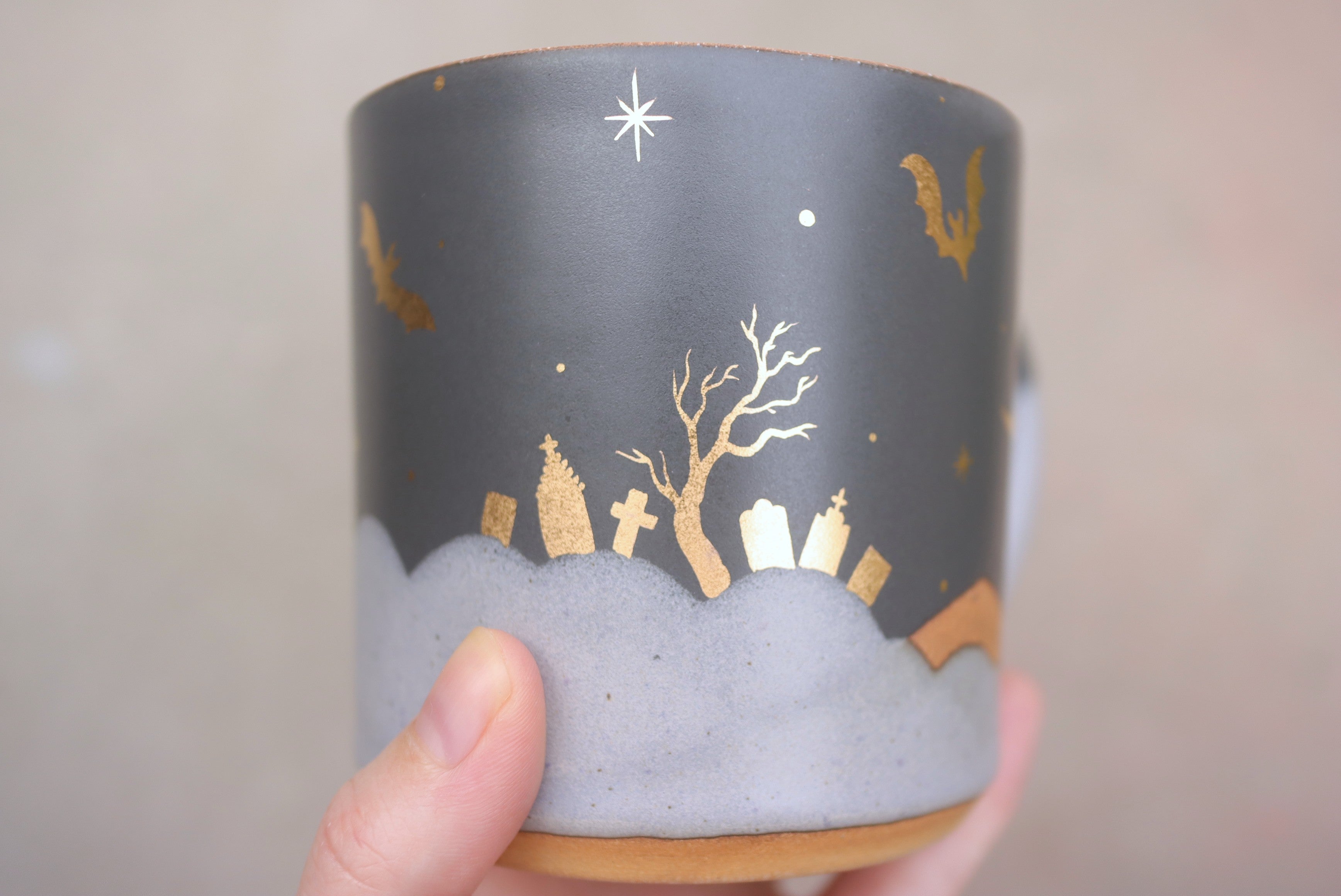18 oz Midnight Fox Classic Mug with Hand Painted 22k Gold Lustre Crescent Moon and Bats over a Cemetery