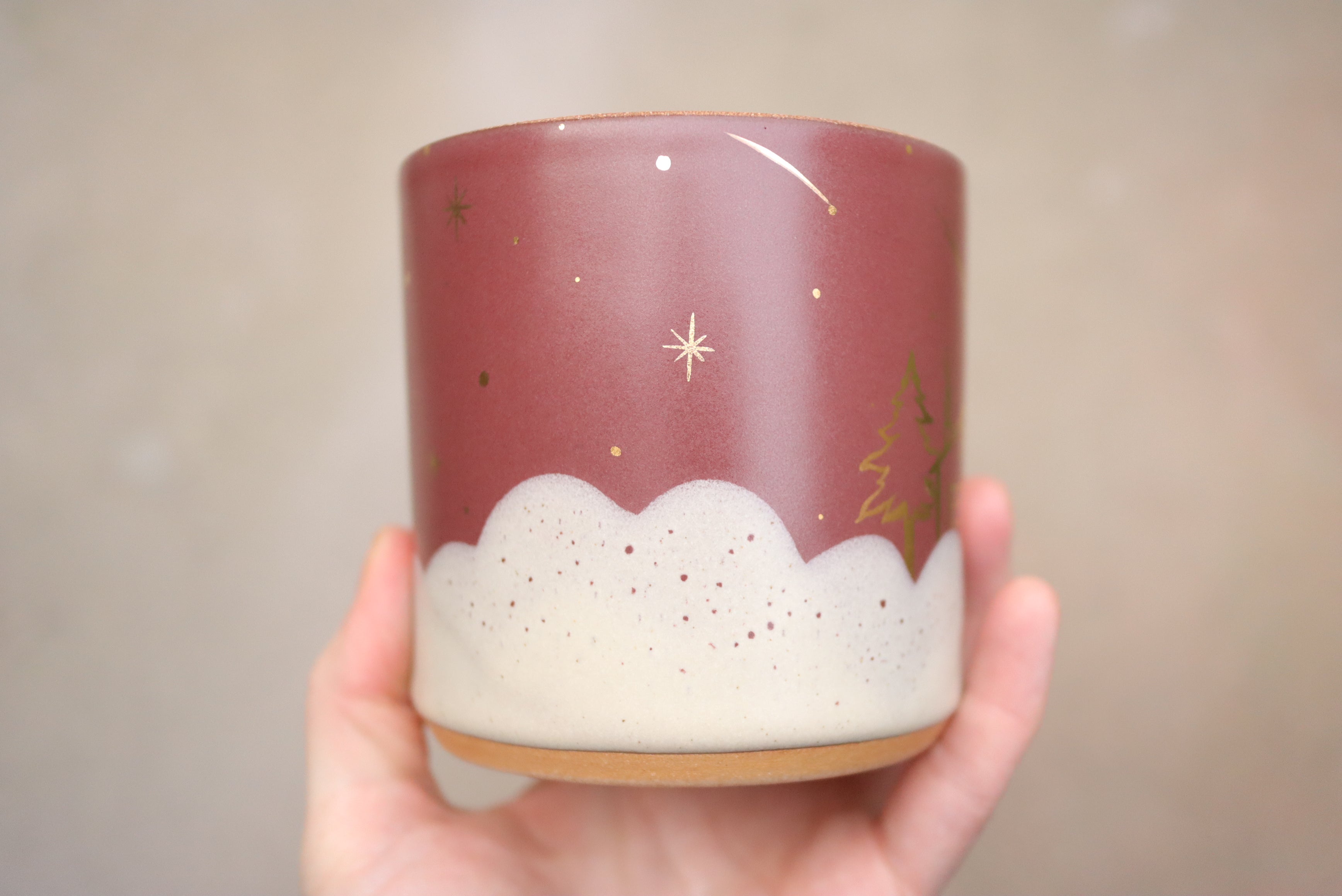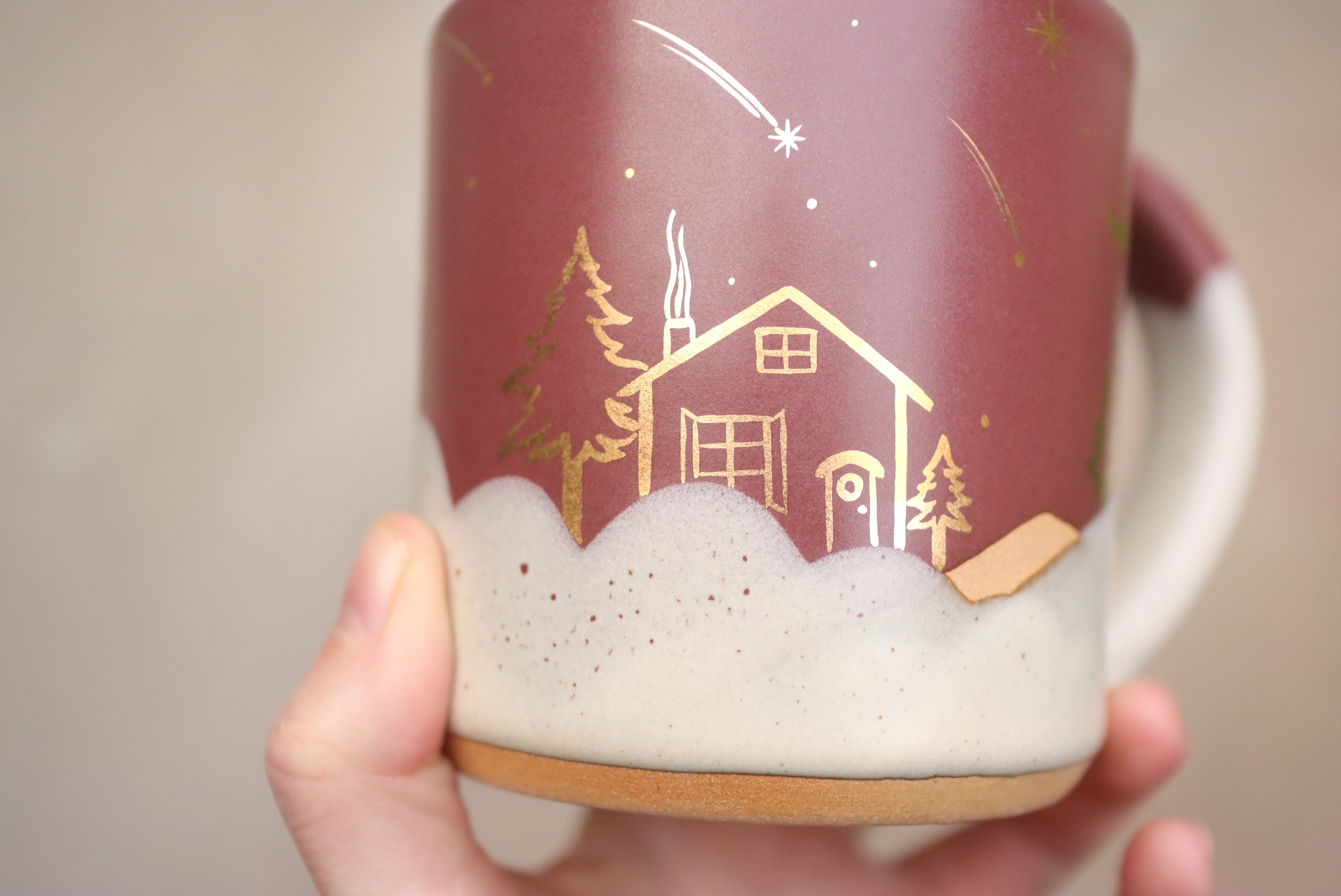18 oz Mulberry Classic Mug with Hand Painted 22k Gold Lustre Crescent Moon, Cozy Cabin, and Trees