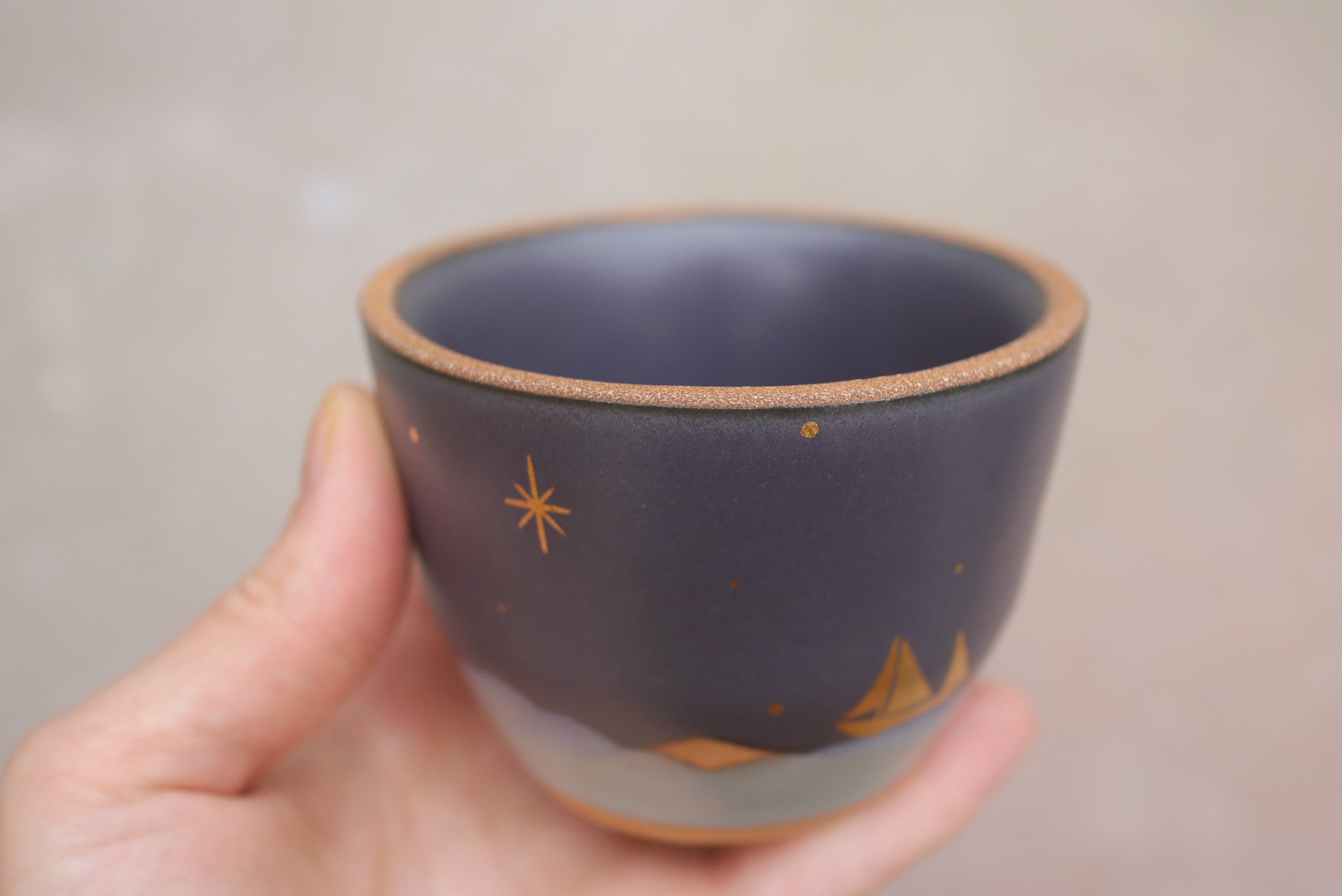 12 oz Classic Nautical Twilight Mug with Hand Painted 22k Gold Lustre Sailboat
