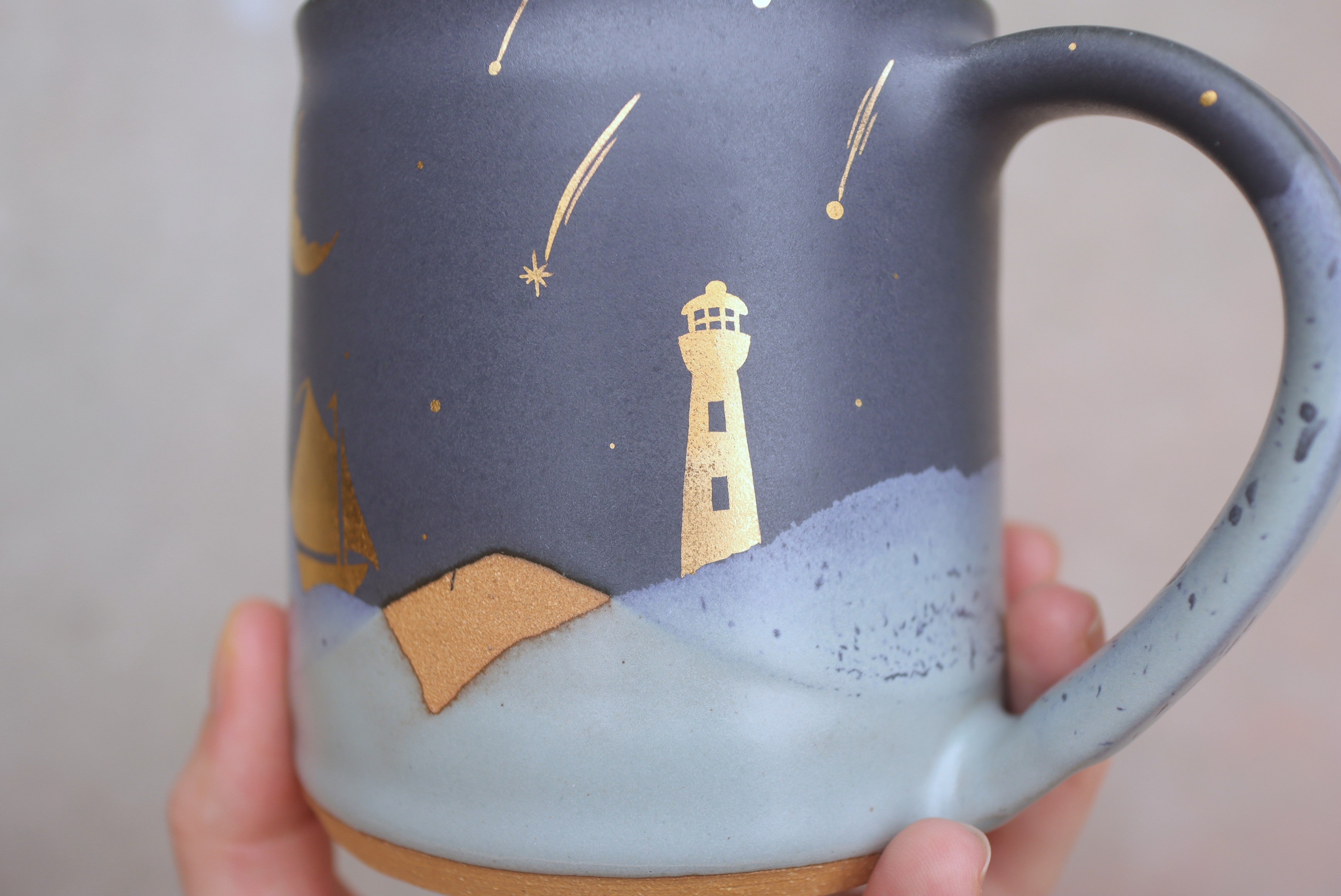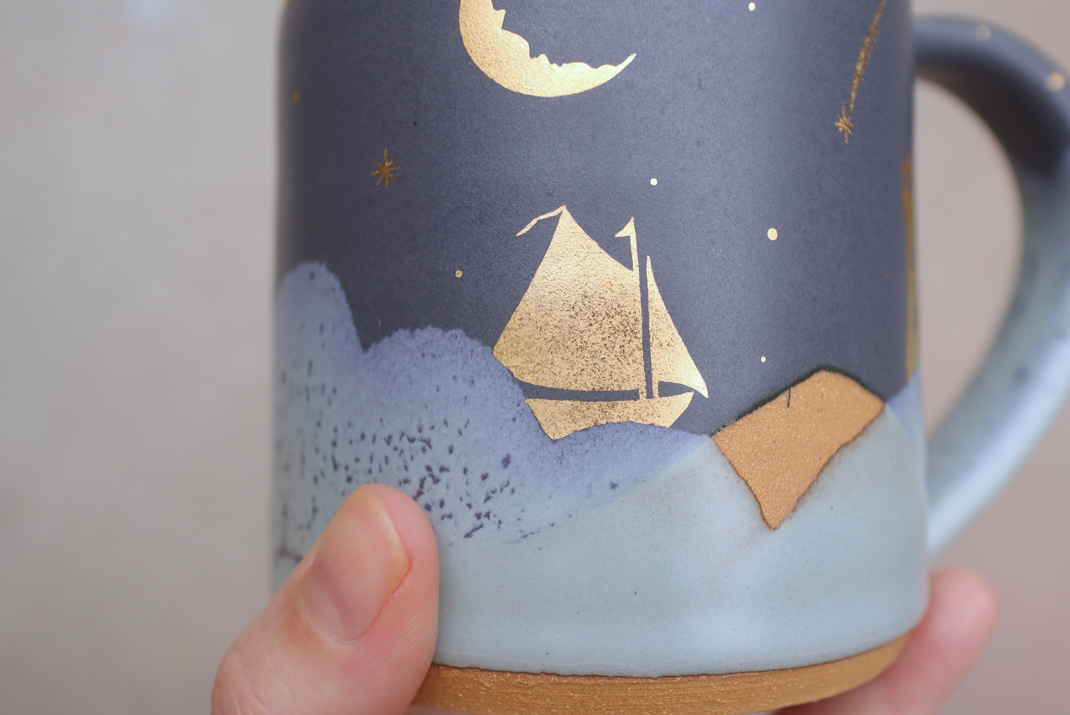 20 oz Wheel Thrown Nautical Twilight Presidio Mug with Hand Painted 22k Gold Lustre Crescent Moon, Sailboat and Lighthouse