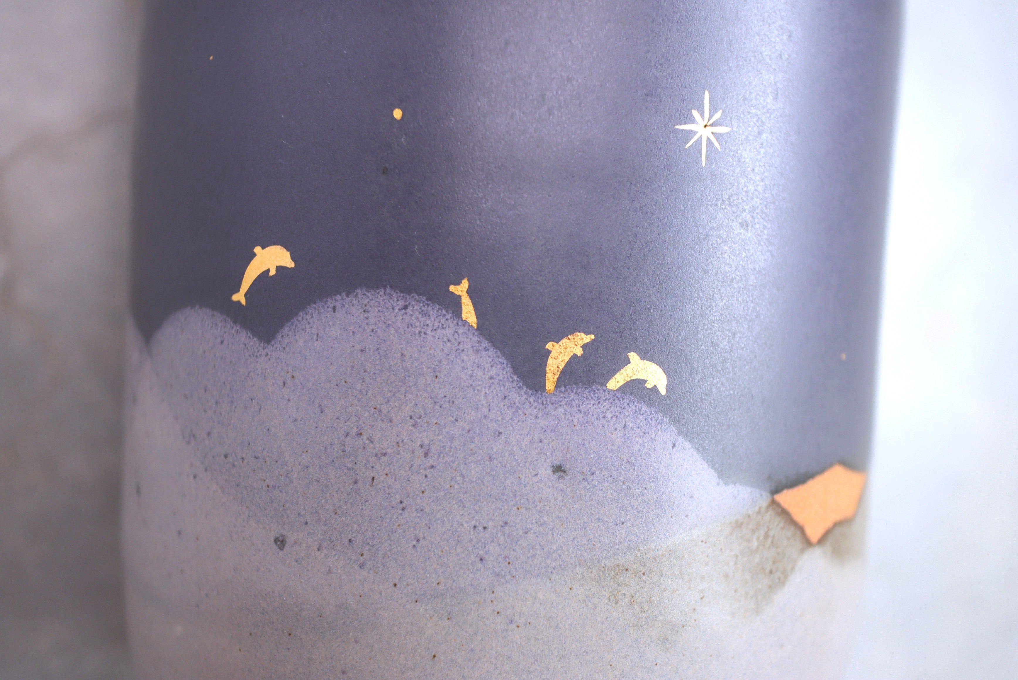 Hand painted with 22k gold lustre Crescent Moon, Sailboat, Dolphins and Whale designs.