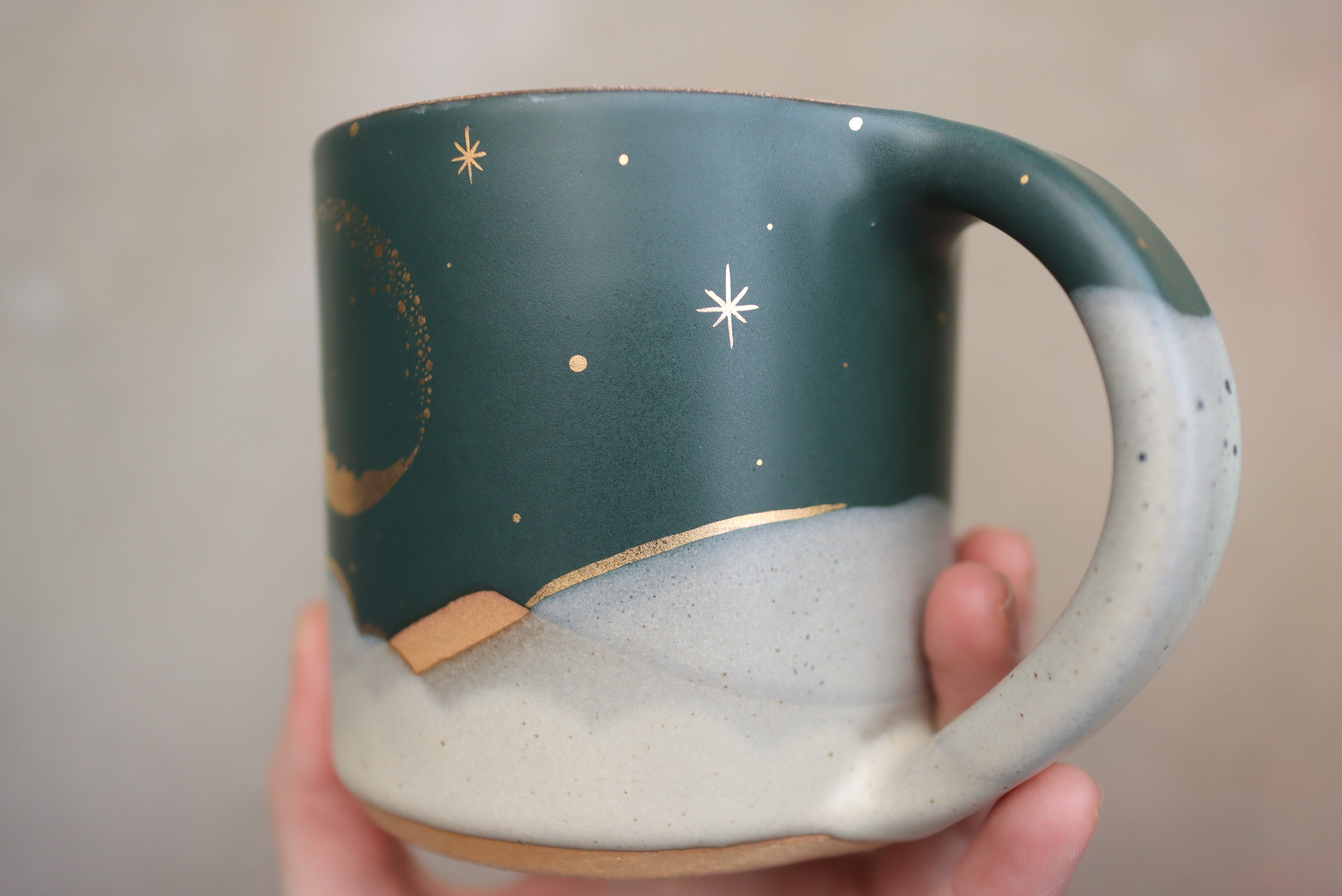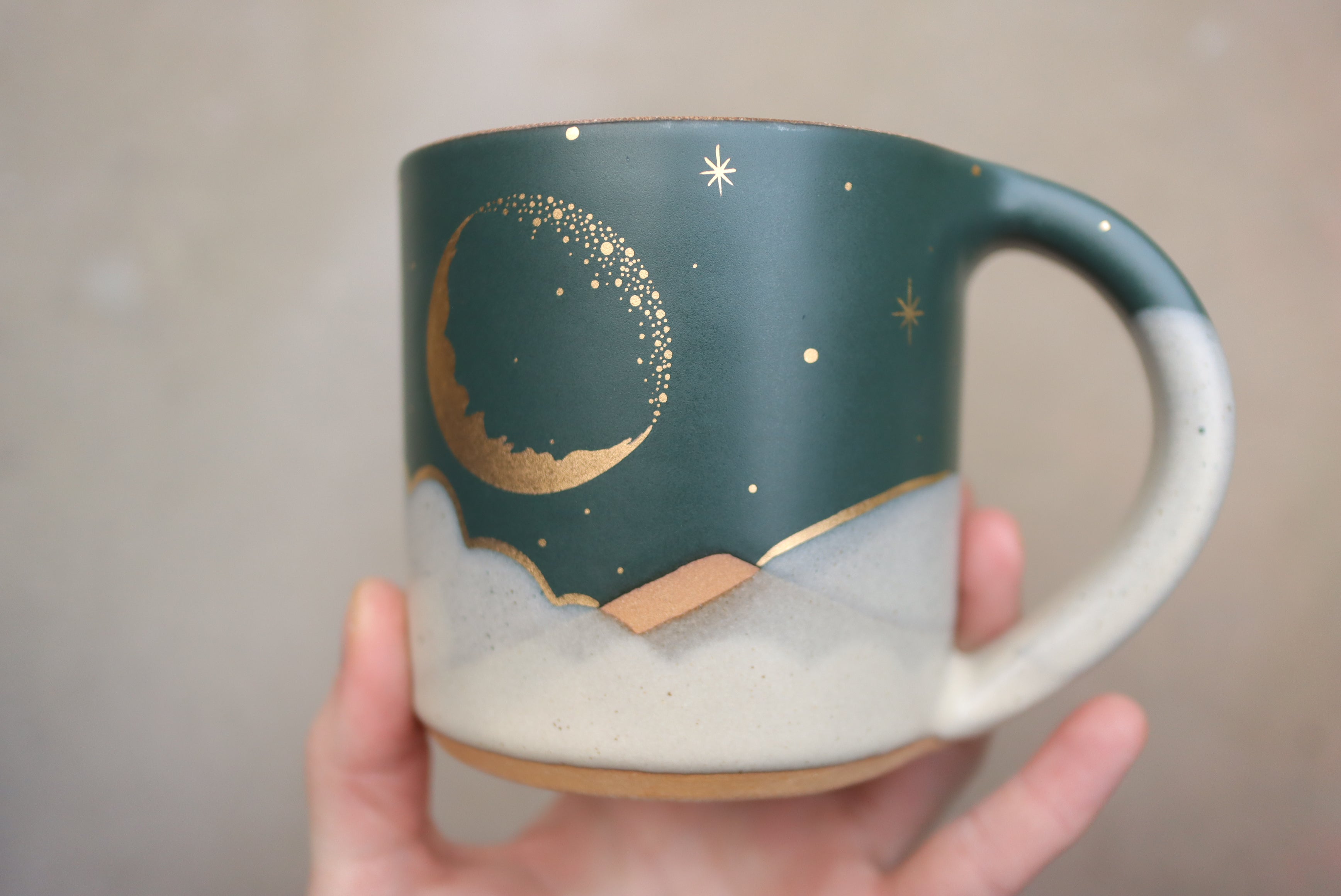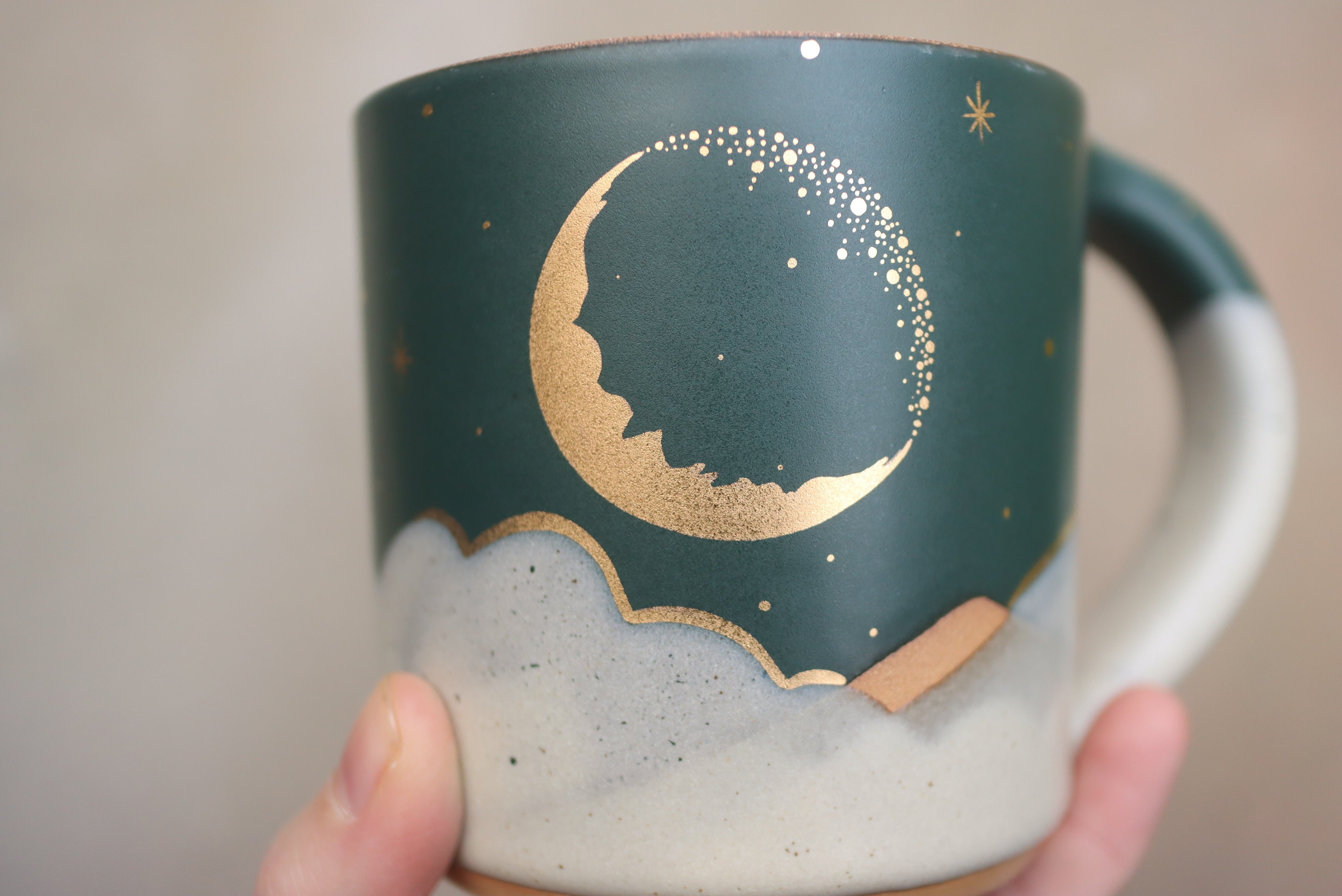 18 oz Peacock Classic Mug with Hand Painted 22k Gold Lustre Crescent Moon with Moonshadow and Moonglow