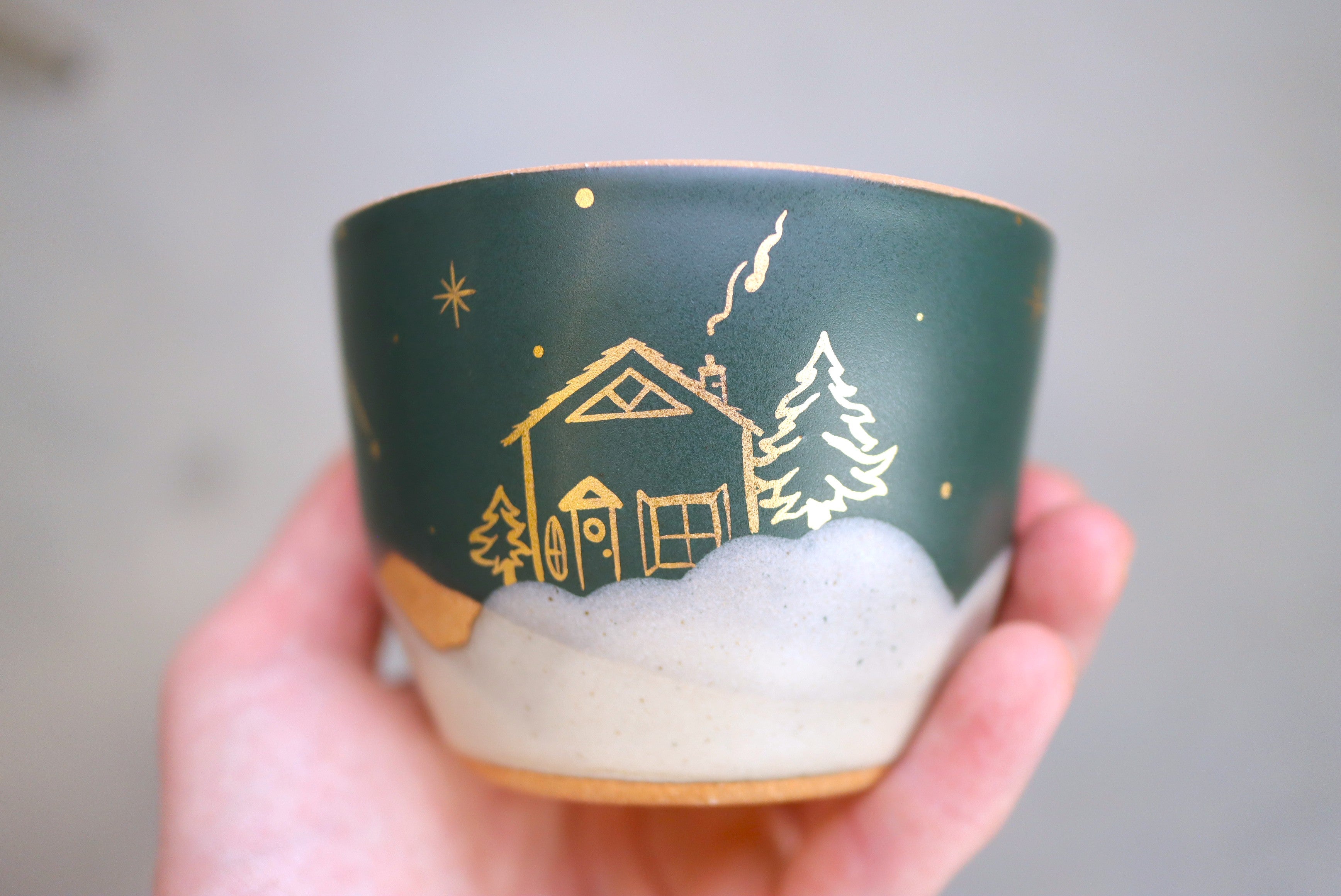 6 oz Peacock Cappuccino Cup with Hand Painted 22k Gold Lustre Cozy Cabin and Trees