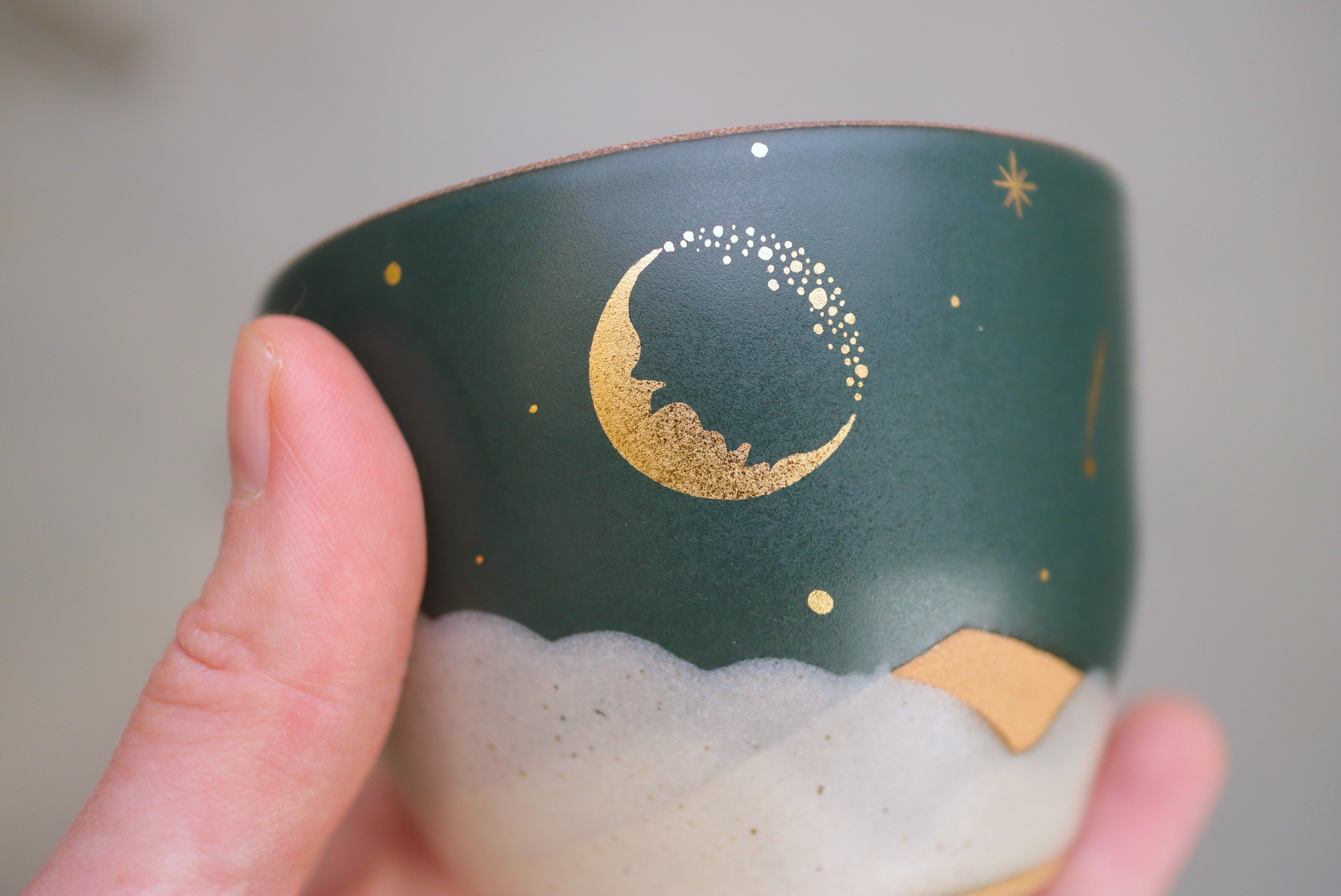 6 oz Peacock Cappuccino Cup with Hand Painted 22k Gold Lustre Crescent Moon with Moonshadow