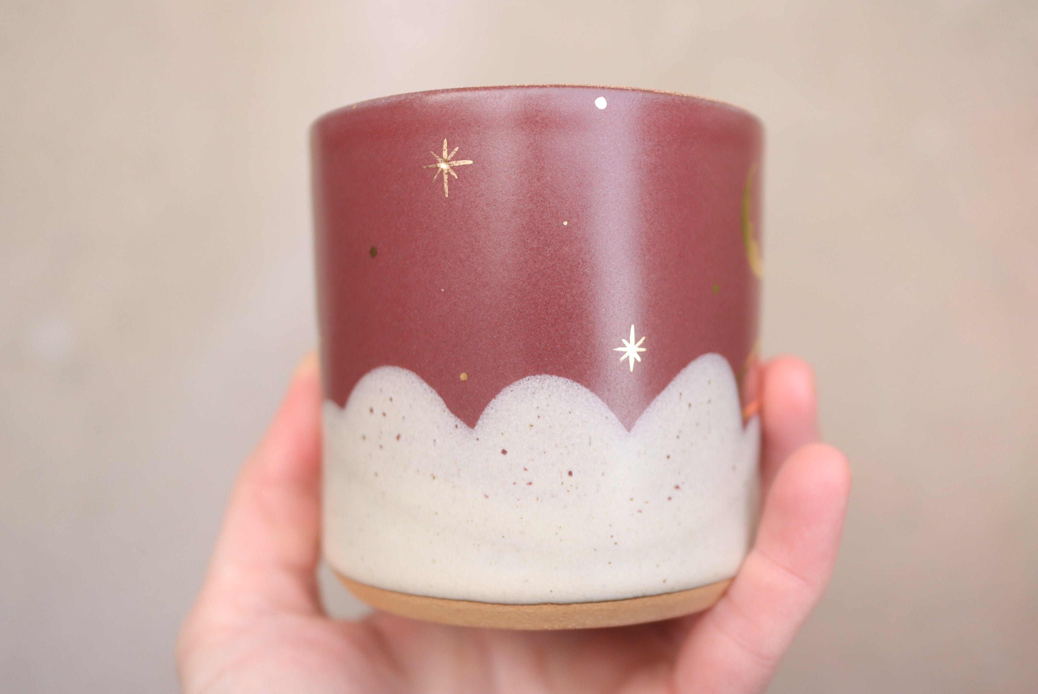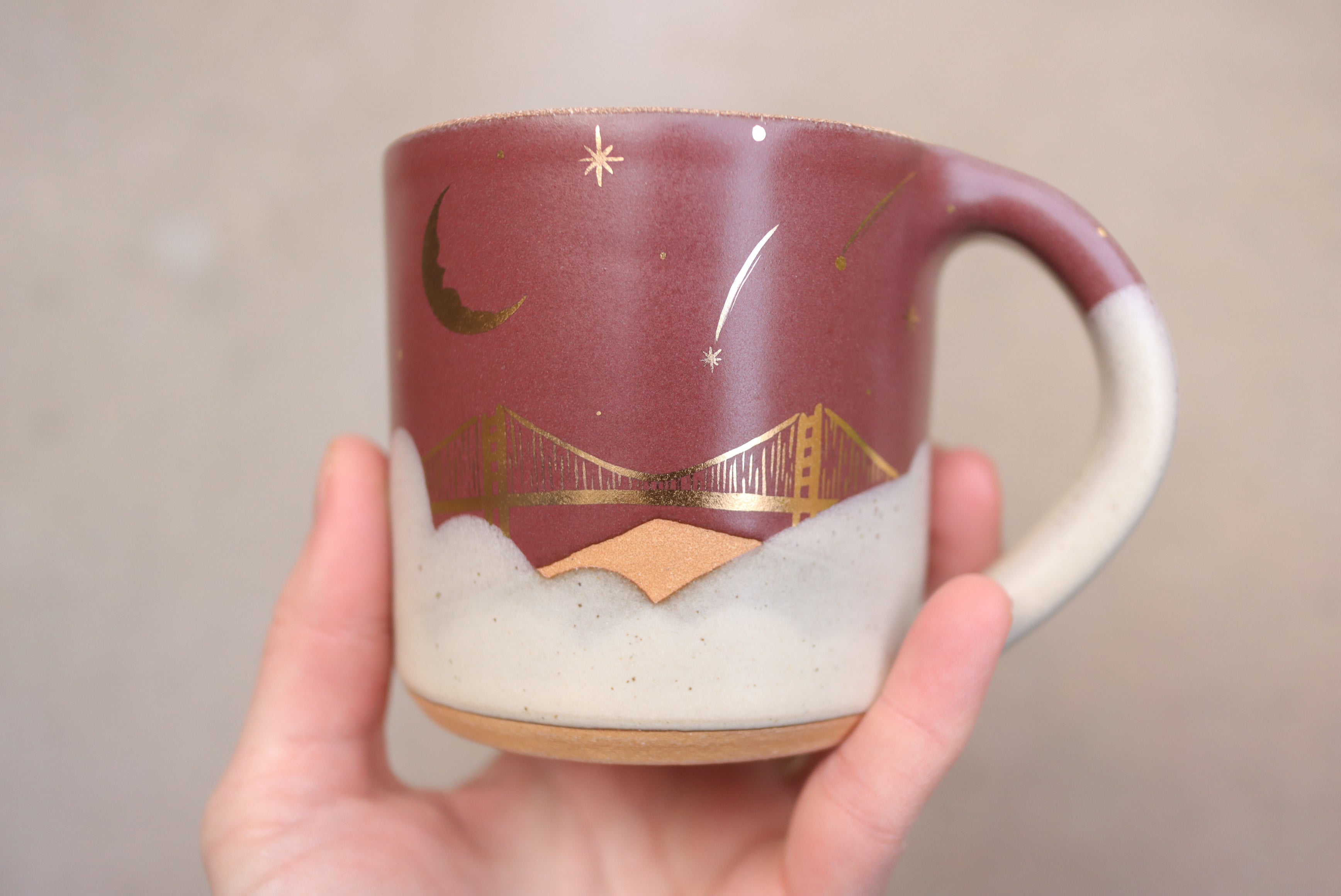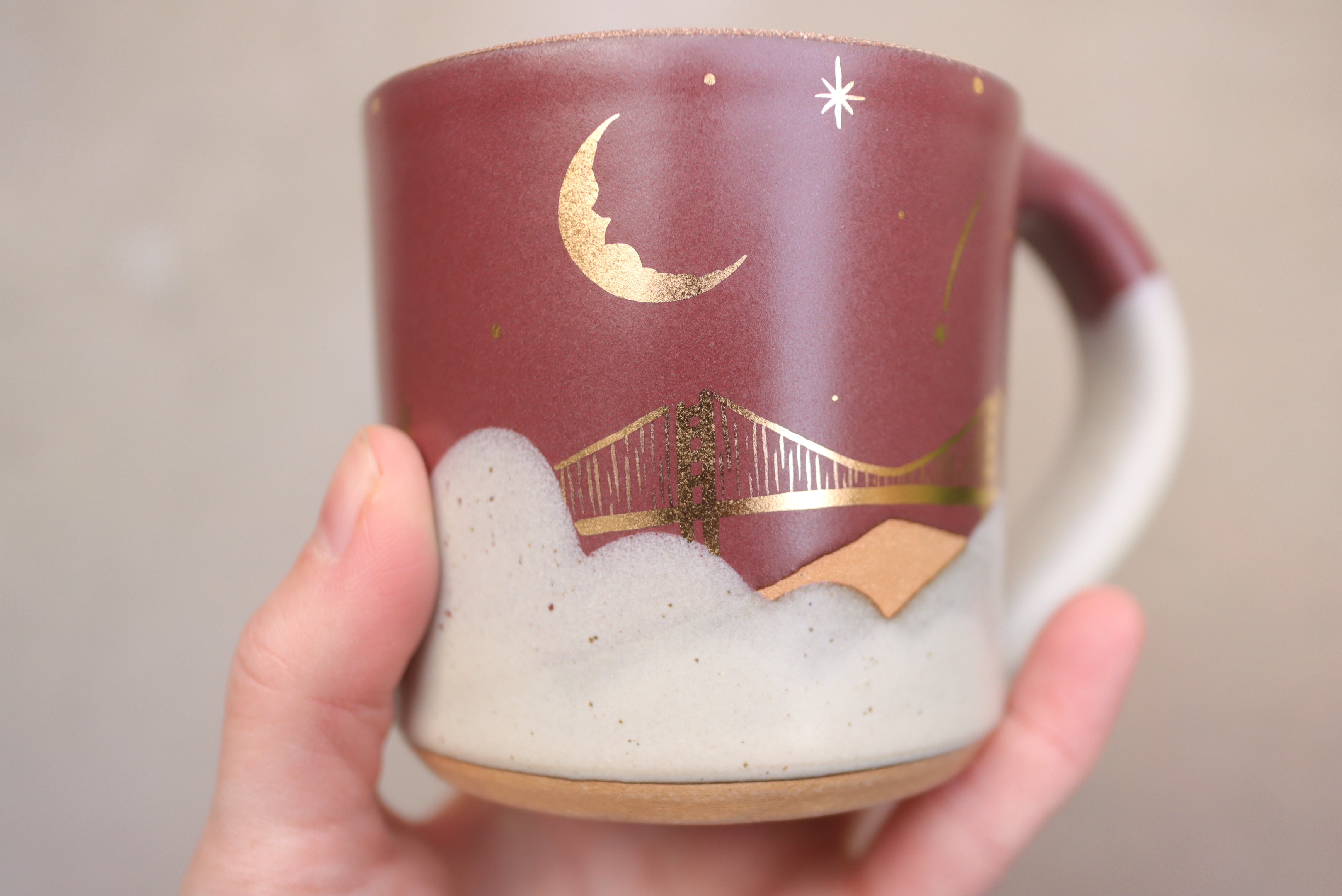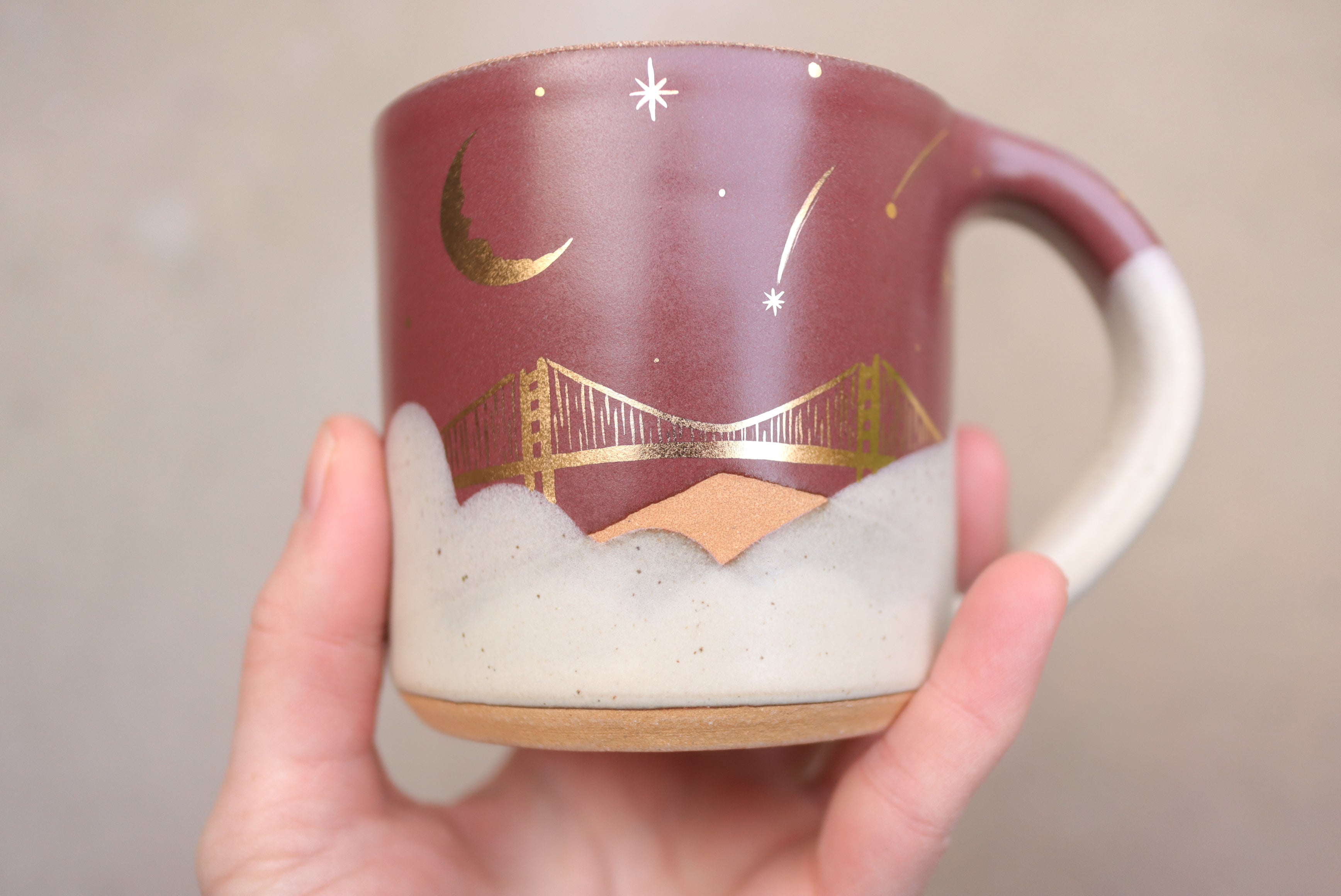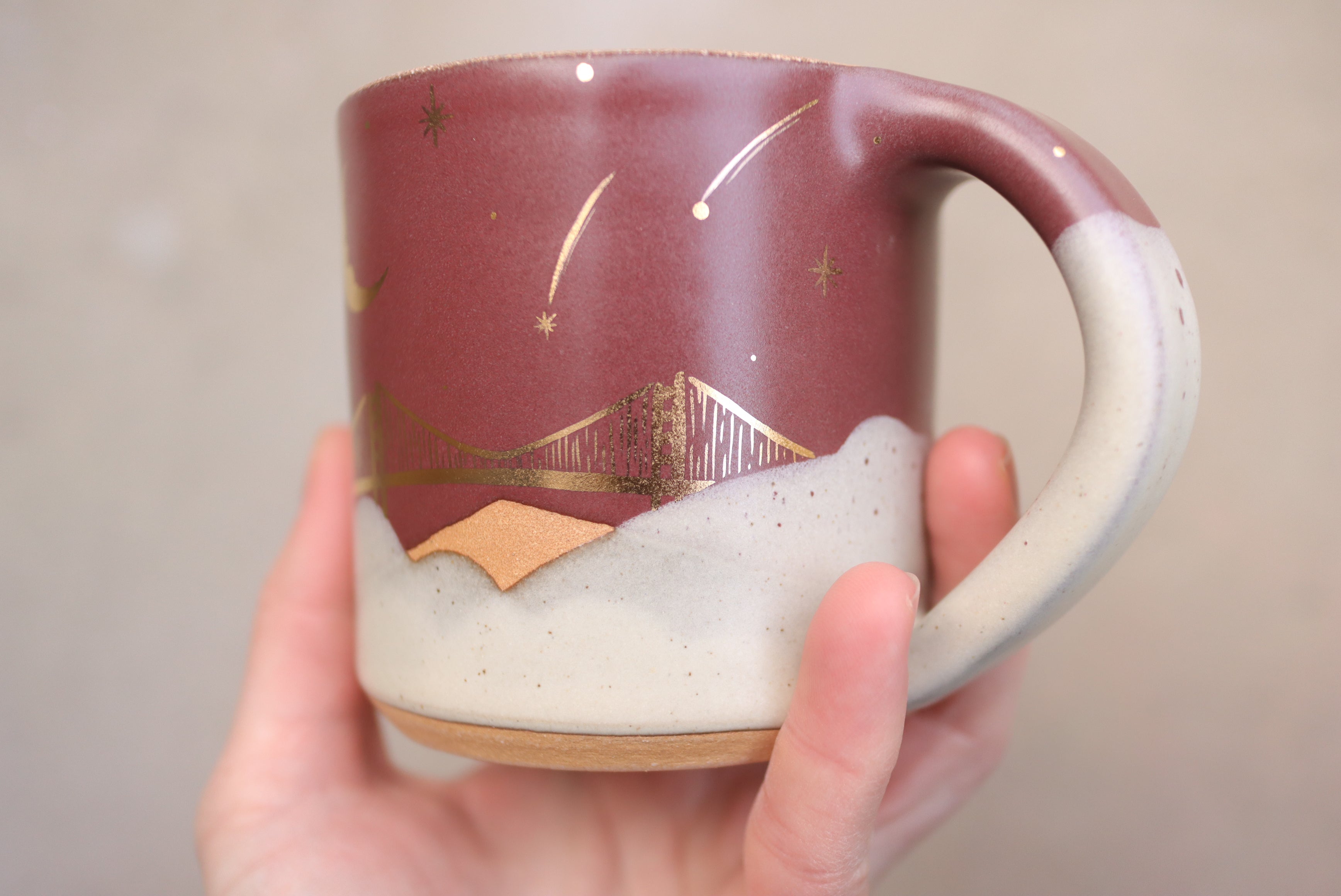12 oz Mulberry Classic Mug with Hand Painted 22k Gold Lustre Crescent Moon over the Golden Gate Bridge