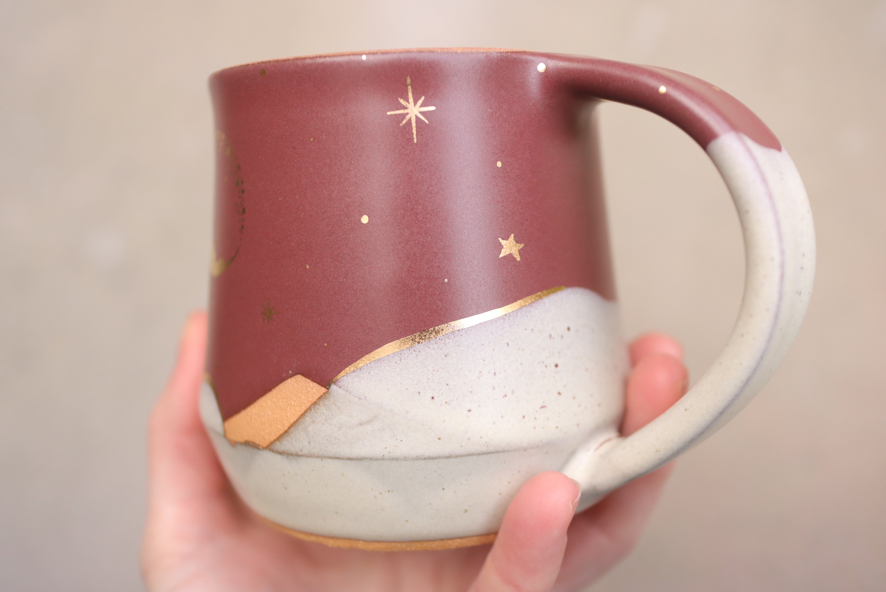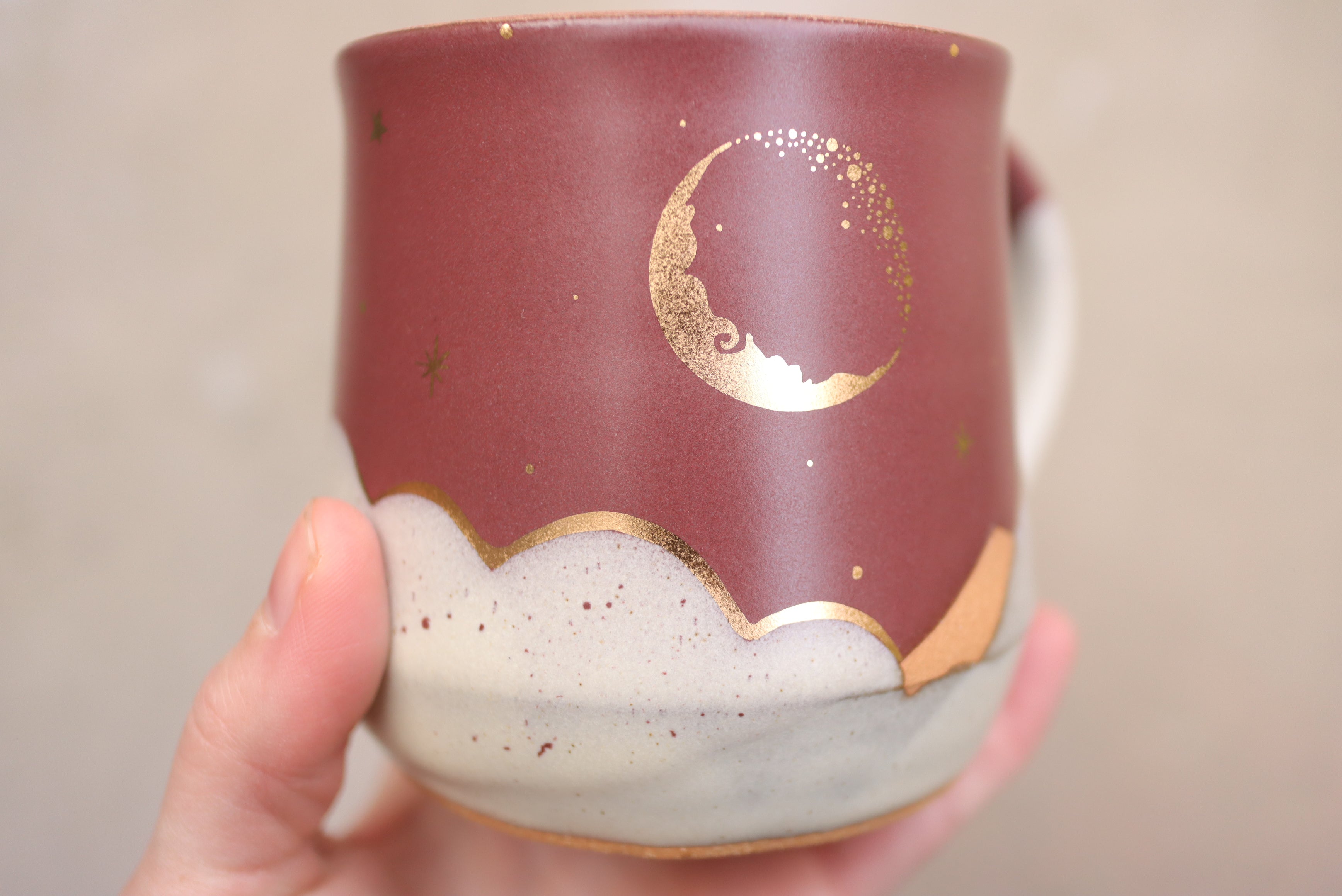 16 oz Wheel Thrown Peacock Mug with Hand Painted 22k Gold Lustre Crescent Moon with Moonshadow