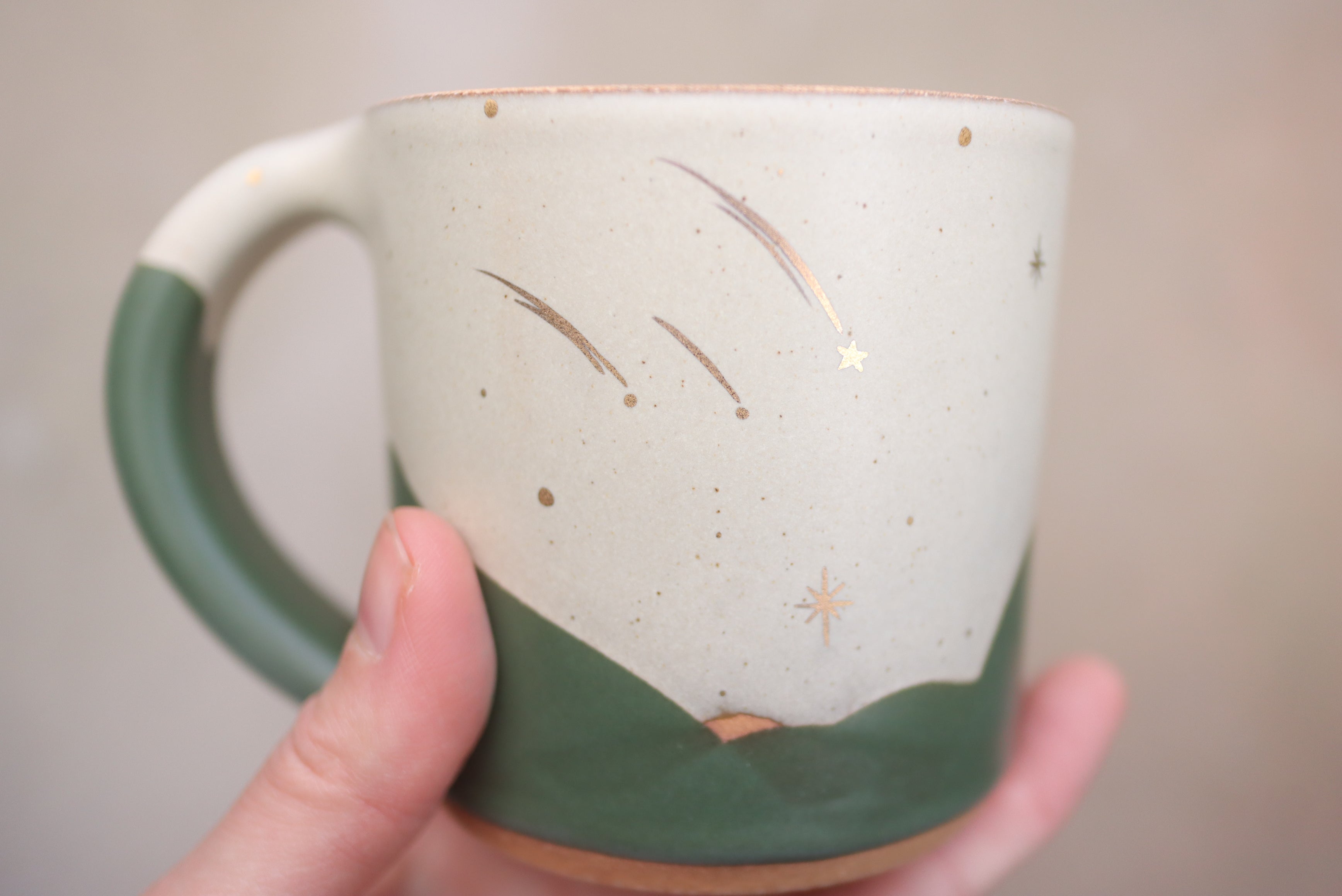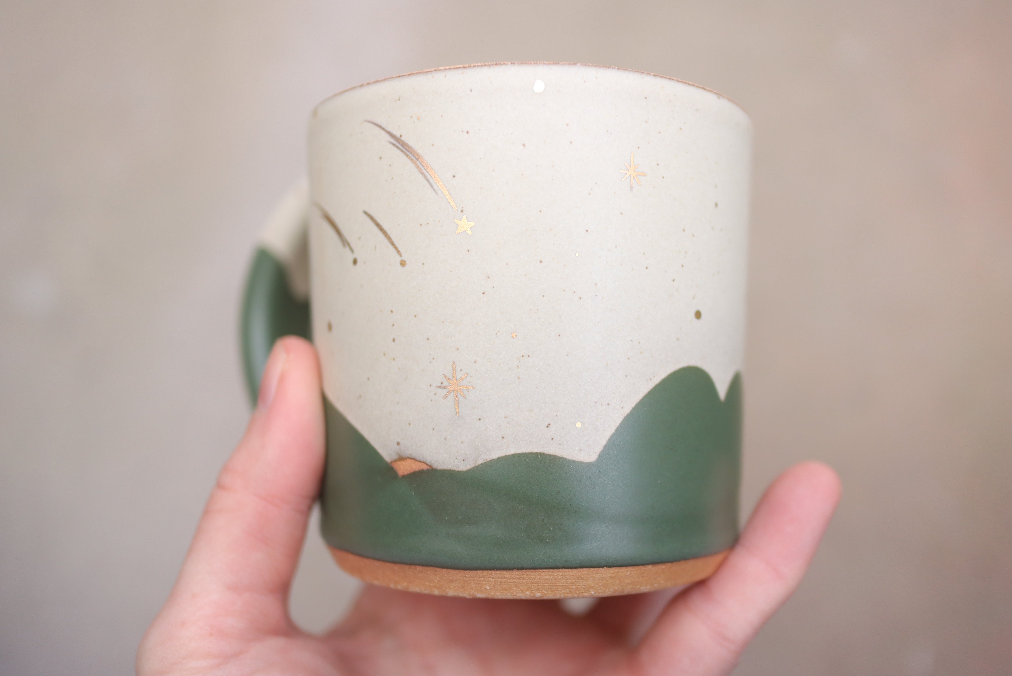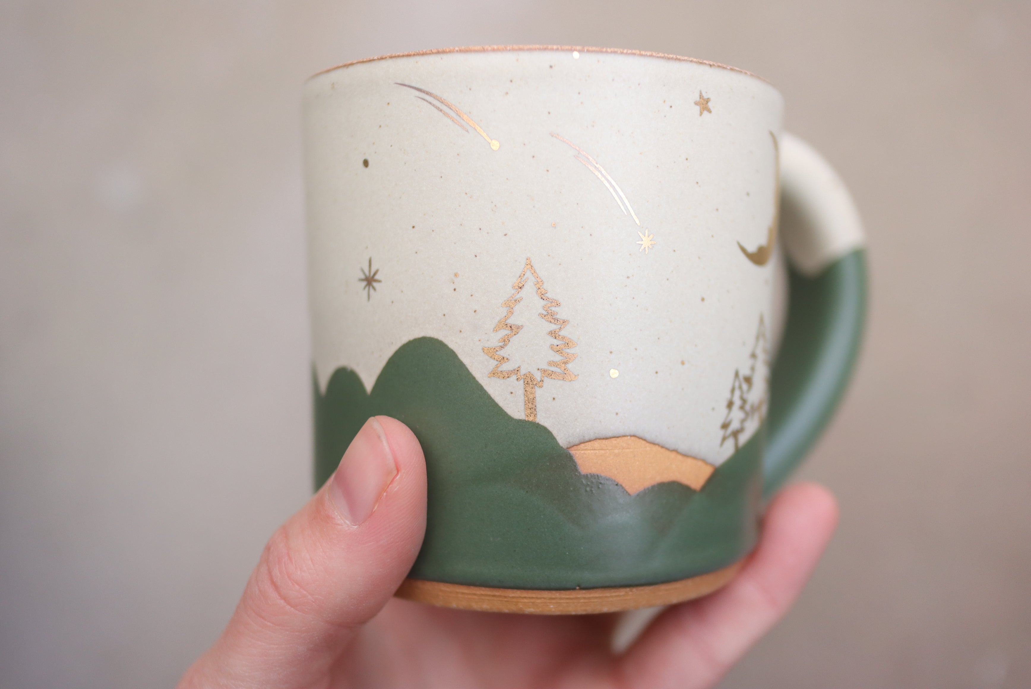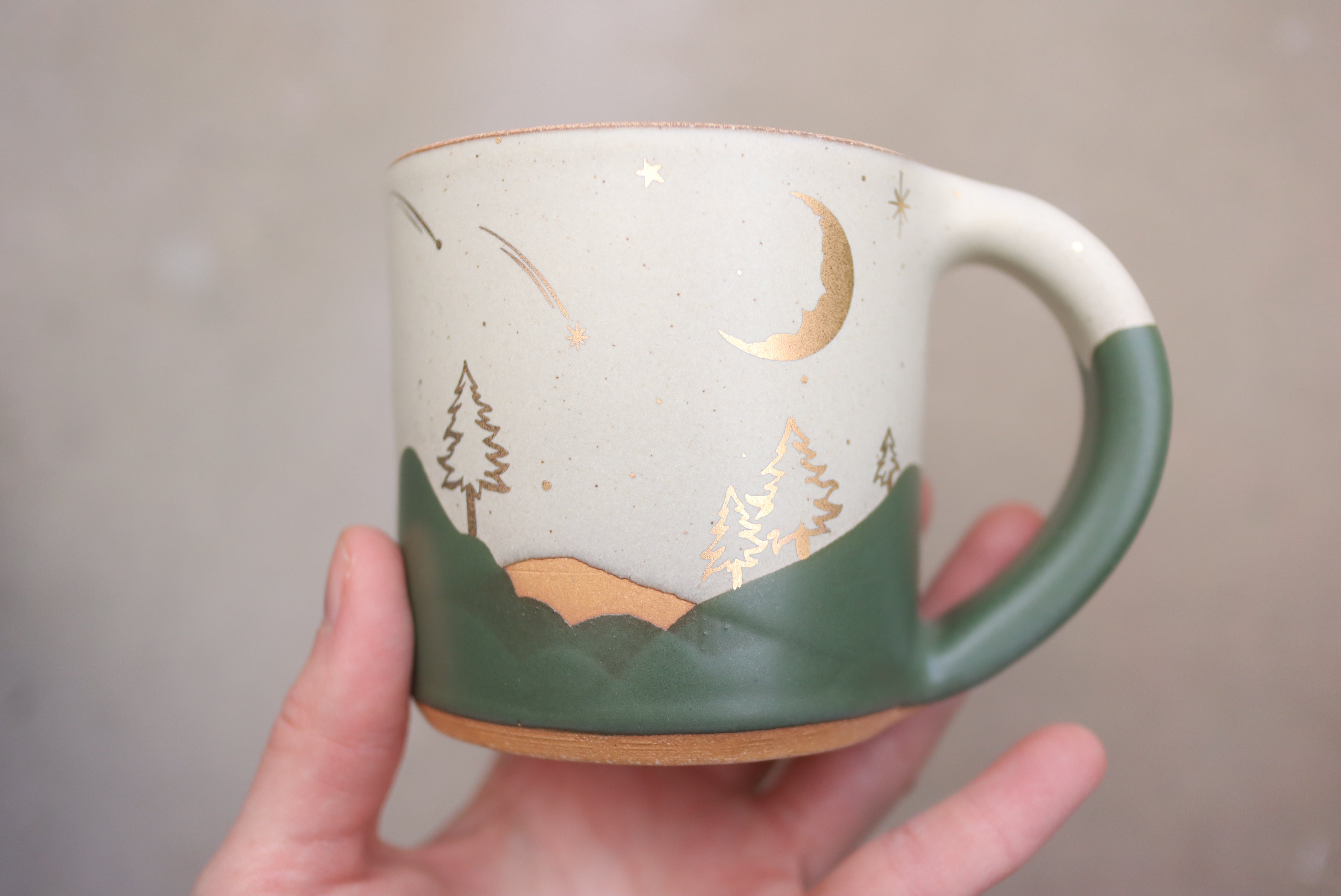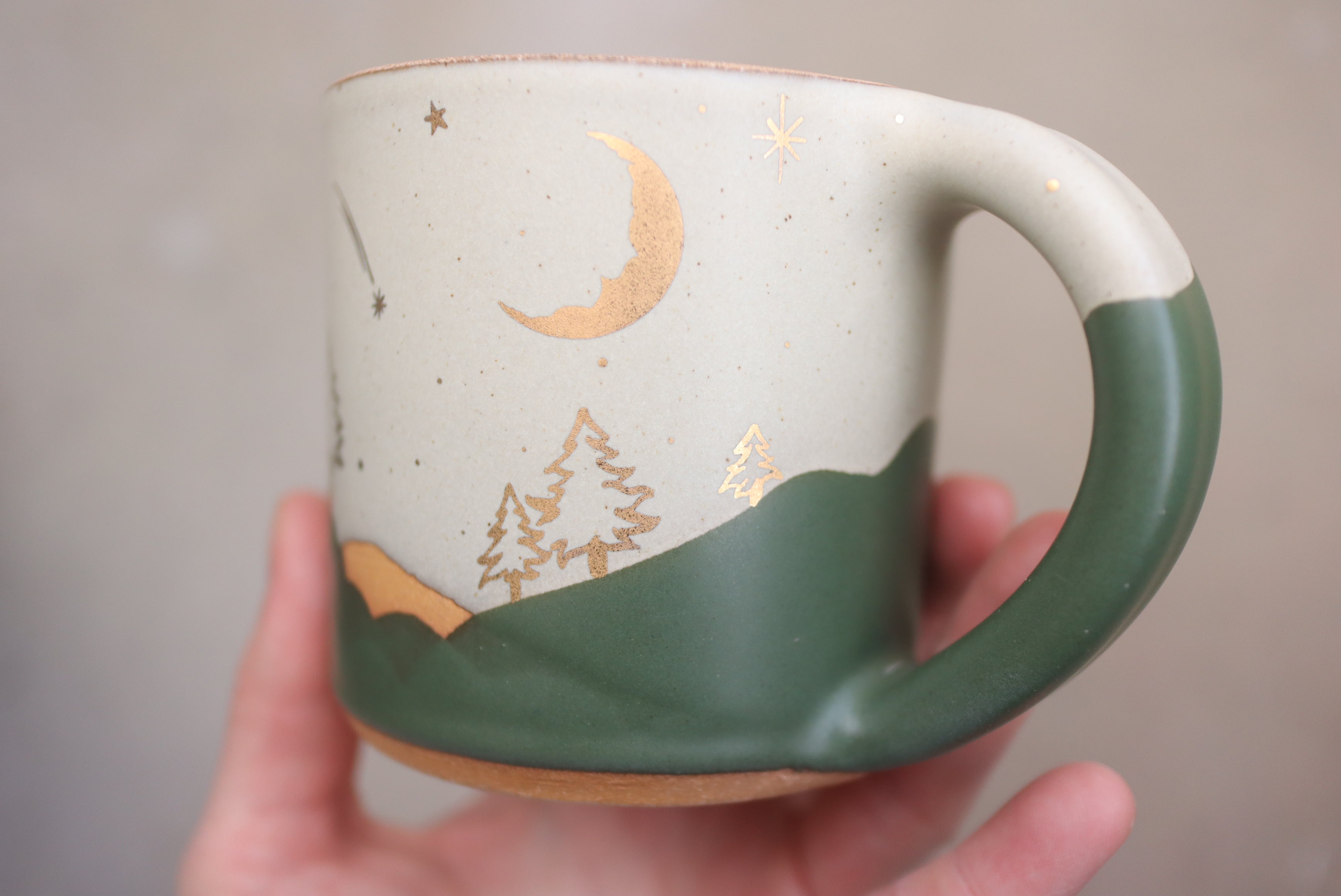12 oz Cedar Classic Mug with Hand Painted 22k Gold Lustre Crescent Moon and Trees